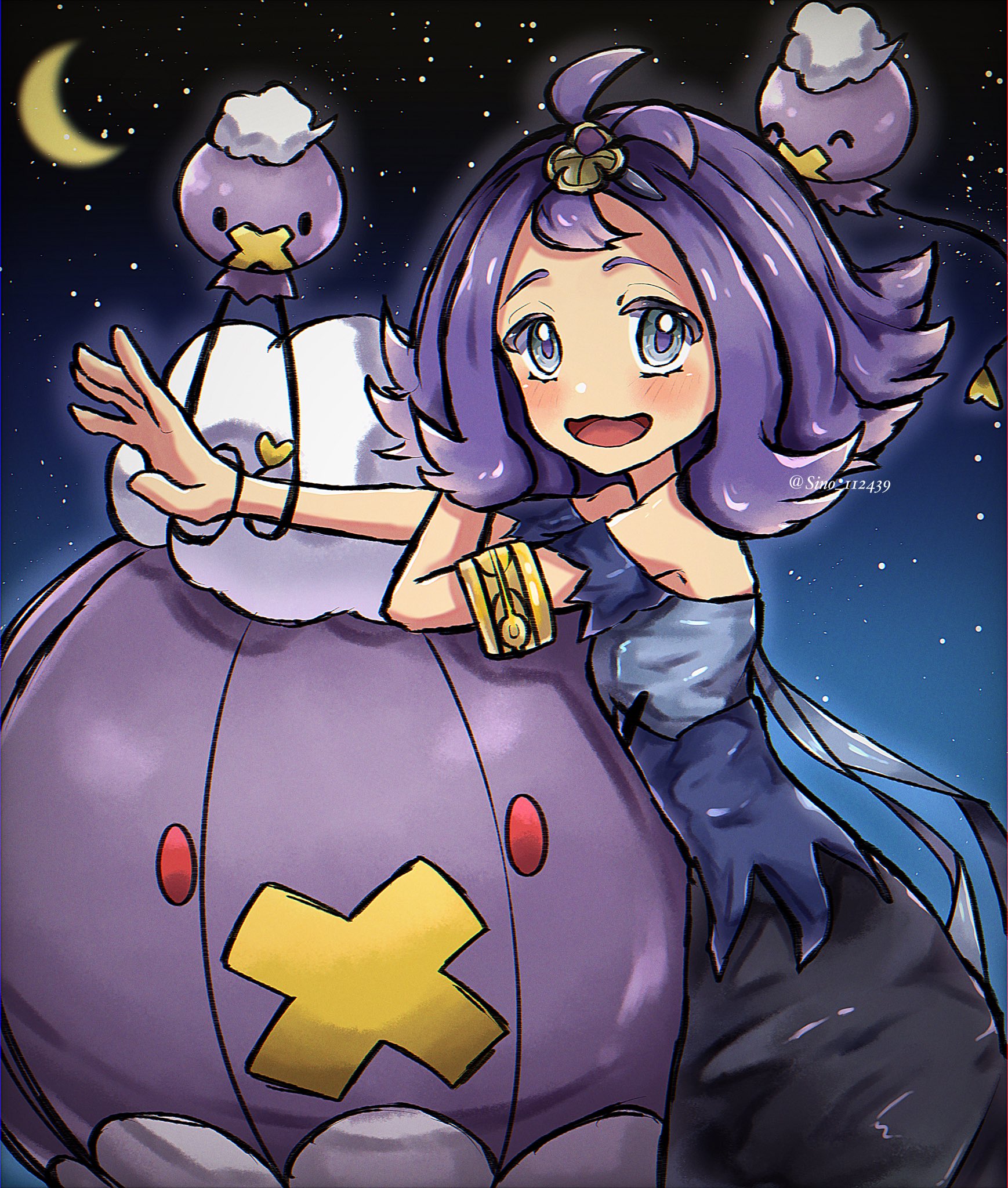 1girl :d acerola_(pokemon) armlet crescent_moon dress drifblim drifloon gen_4_pokemon highres jewelry looking_at_viewer moon nintendo open_mouth pokemon pokemon_(creature) pokemon_sun_and_moon purple_eyes purple_hair short_hair sino_(pcxg4558) smile star_(sky) twitter_username