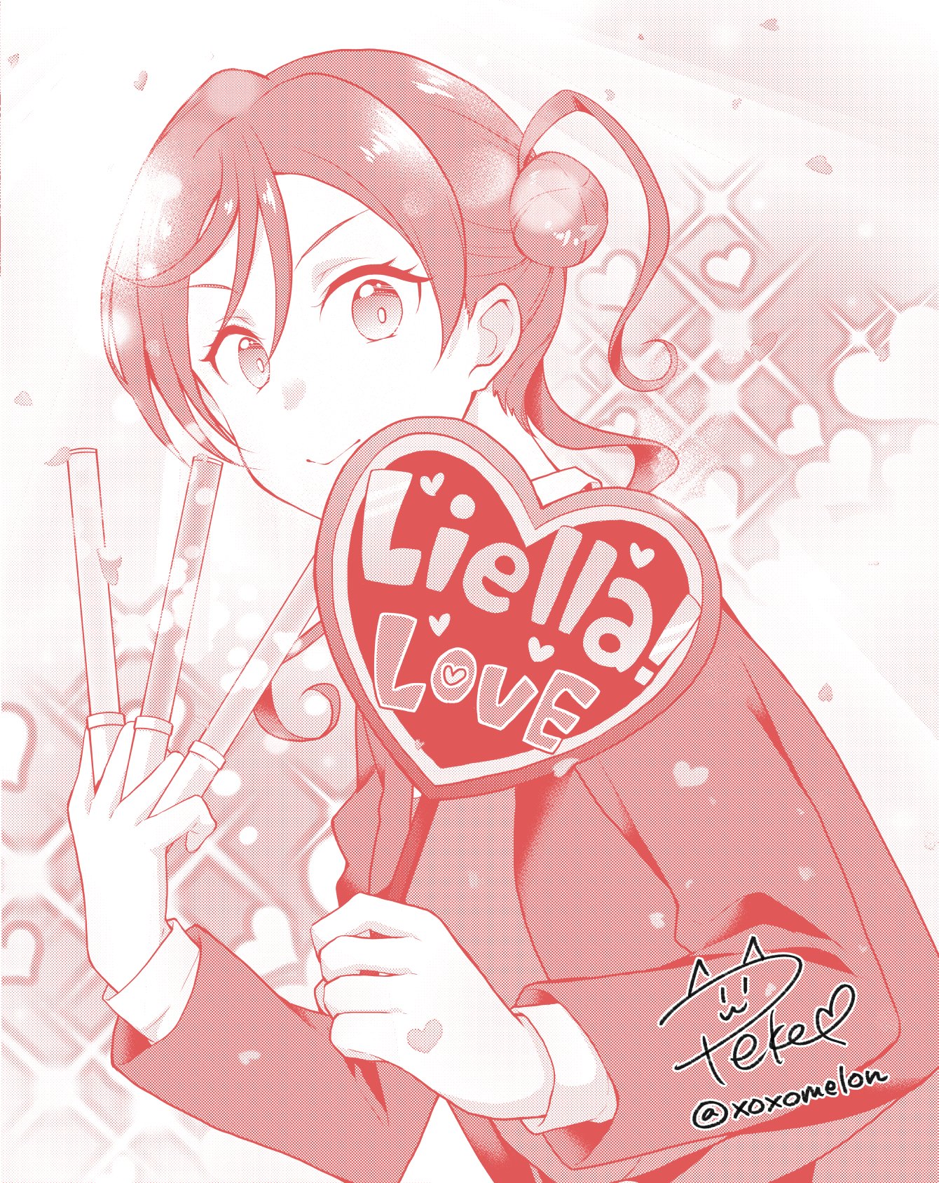 1girl closed_mouth commentary glowstick hair_between_eyes hair_bun hand_fan heart highres holding holding_fan holding_glowstick jacket long_sleeves looking_at_viewer love_live! love_live!_superstar!! monochrome open_clothes open_jacket peke_(xoxo_melon) penlight_(glowstick) red_theme school_uniform short_hair_with_long_locks signature single_side_bun smile solo twitter_username upper_body v-shaped_eyebrows white_background winter_uniform yoneme_mei yuigaoka_school_uniform