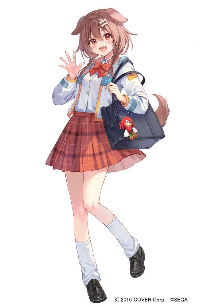1girl animal_ears bag black_bag black_footwear bow bowtie braid brown_eyes brown_hair dog_ears dog_girl dog_tail fukahire_(ruinon) full_body hololive inugami_korone jacket kneehighs knuckles_the_echidna loafers long_sleeves looking_at_viewer medium_hair official_art open_clothes open_jacket open_mouth school_bag school_uniform shirt shoes simple_background skirt smile socks sonic_(series) tail teeth twin_braids upper_teeth_only virtual_youtuber white_background white_jacket white_shirt white_socks