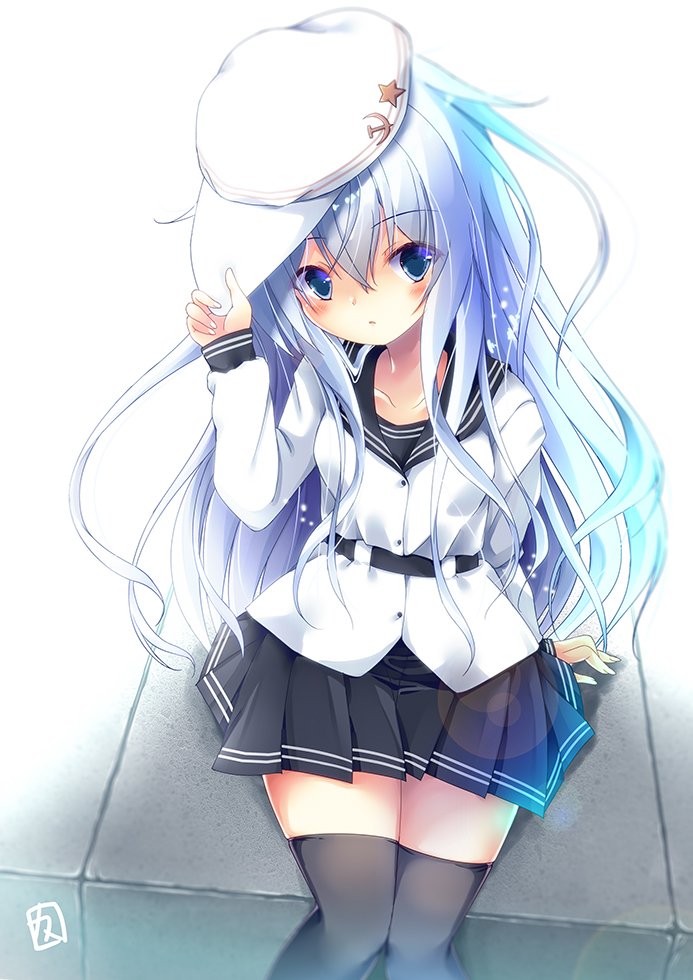 1girl belt black_belt black_sailor_collar black_skirt black_thighhighs blue_eyes blue_hair flat_cap hair_between_eyes hammer_and_sickle hat hibiki_(kancolle) kamiya_yuuji kantai_collection looking_at_viewer sailor_collar sailor_shirt school_uniform serafuku shirt skirt solo thighhighs verniy_(kancolle) white_hat white_shirt