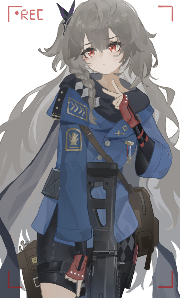 1girl asymmetrical_legwear bag belt black_scarf blue_jacket braid cowboy_shot fingerless_gloves girls'_frontline gloves grey_hair gun hair_ornament holding holding_gun holding_weapon jacket kaixinniujiang long_hair recording red_eyes red_gloves scarf solo sp9_(girls'_frontline) stribog_sp9 submachine_gun thigh_belt thigh_strap v viewfinder weapon