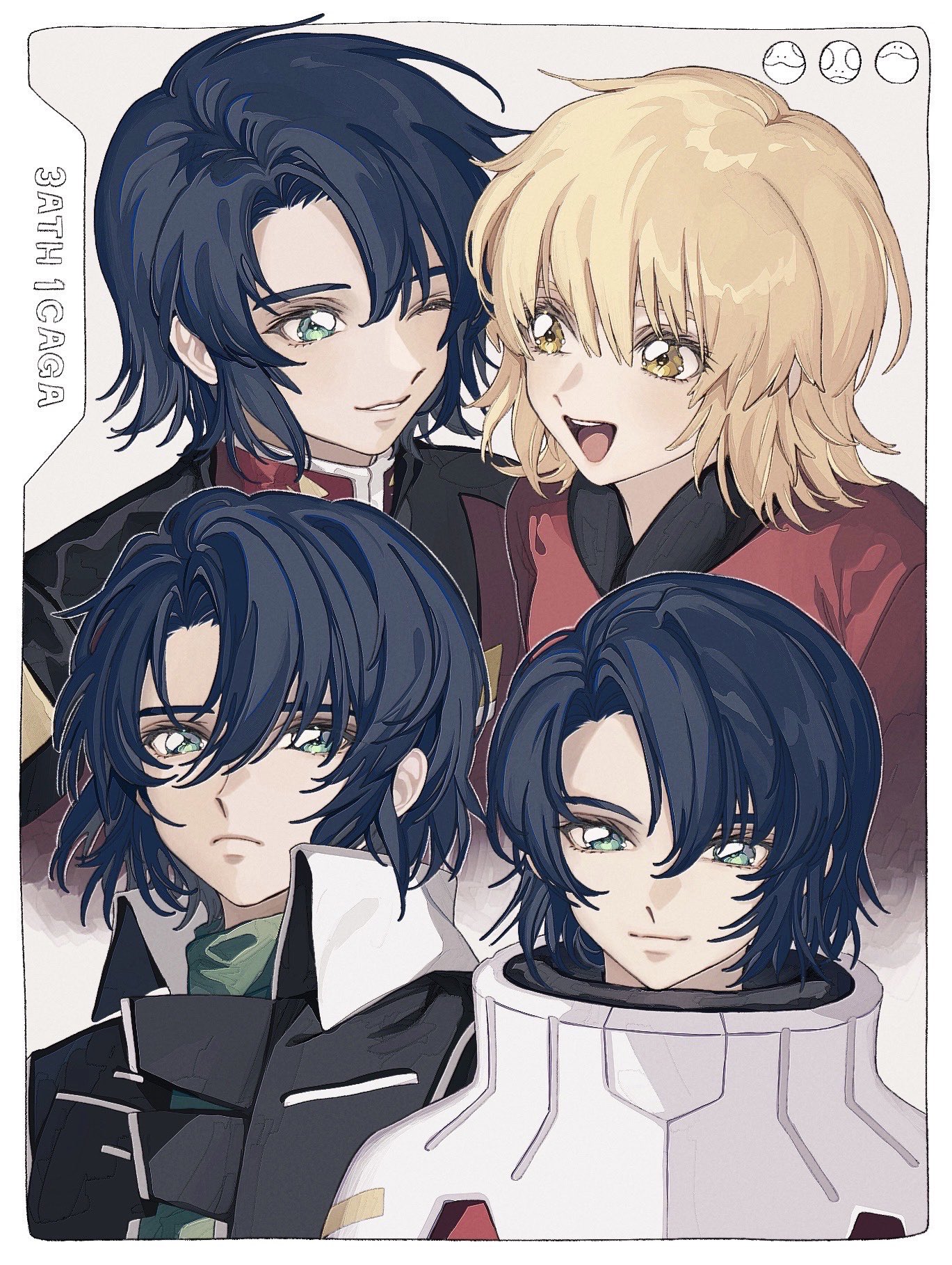 1girl 3boys ao_(ao0_0nemu) athrun_zala black_jacket blonde_hair blue_hair border cagalli_yula_athha green_eyes grey_background gundam gundam_seed gundam_seed_destiny gundam_seed_freedom happy highres jacket looking_at_another looking_at_viewer military_uniform multiple_boys multiple_views one_eye_closed open_mouth red_jacket sad short_hair simple_background smile upper_body white_border yellow_eyes zaft_uniform