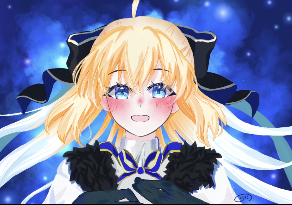 1girl aesc_(fate) aesc_(savior)_(fate) ahoge armor armored_dress black_gloves blonde_hair blue_eyes blue_hair bow breastplate breasts cloak dress fate/grand_order fate_(series) fur-trimmed_cloak fur_trim gloves hair_bow long_hair looking_at_viewer medium_breasts multicolored_hair open_mouth ponytail smile solo two-tone_hair umeboshi_disk very_long_hair white_cloak white_dress