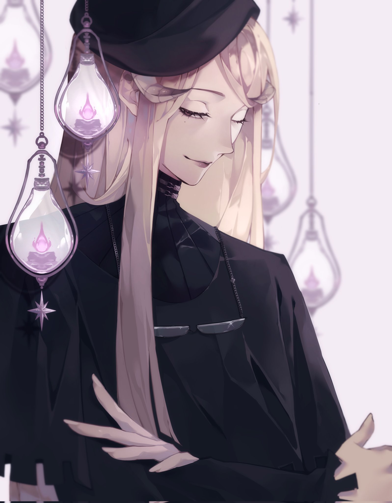 1boy beret black_eyes black_shirt blonde_hair glasses hat highres horns lamp long_hair male_focus metaphor:_refantazio mole more_(metaphor:_refantazio) one_eye_closed sephykyun shirt smile sweater turtleneck turtleneck_sweater