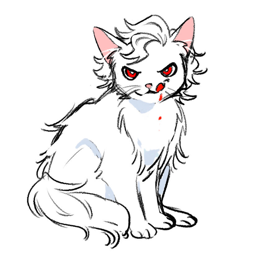 animal animal_focus animalization astarion baldur's_gate baldur's_gate_3 blood blood_on_body blood_on_face cat commentary dungeons_&_dragons licking_lips looking_at_viewer no_humans panco500 red_eyes simple_background sitting untranslatable_commentary tongue tongue_out wavy_hair white_background white_fur