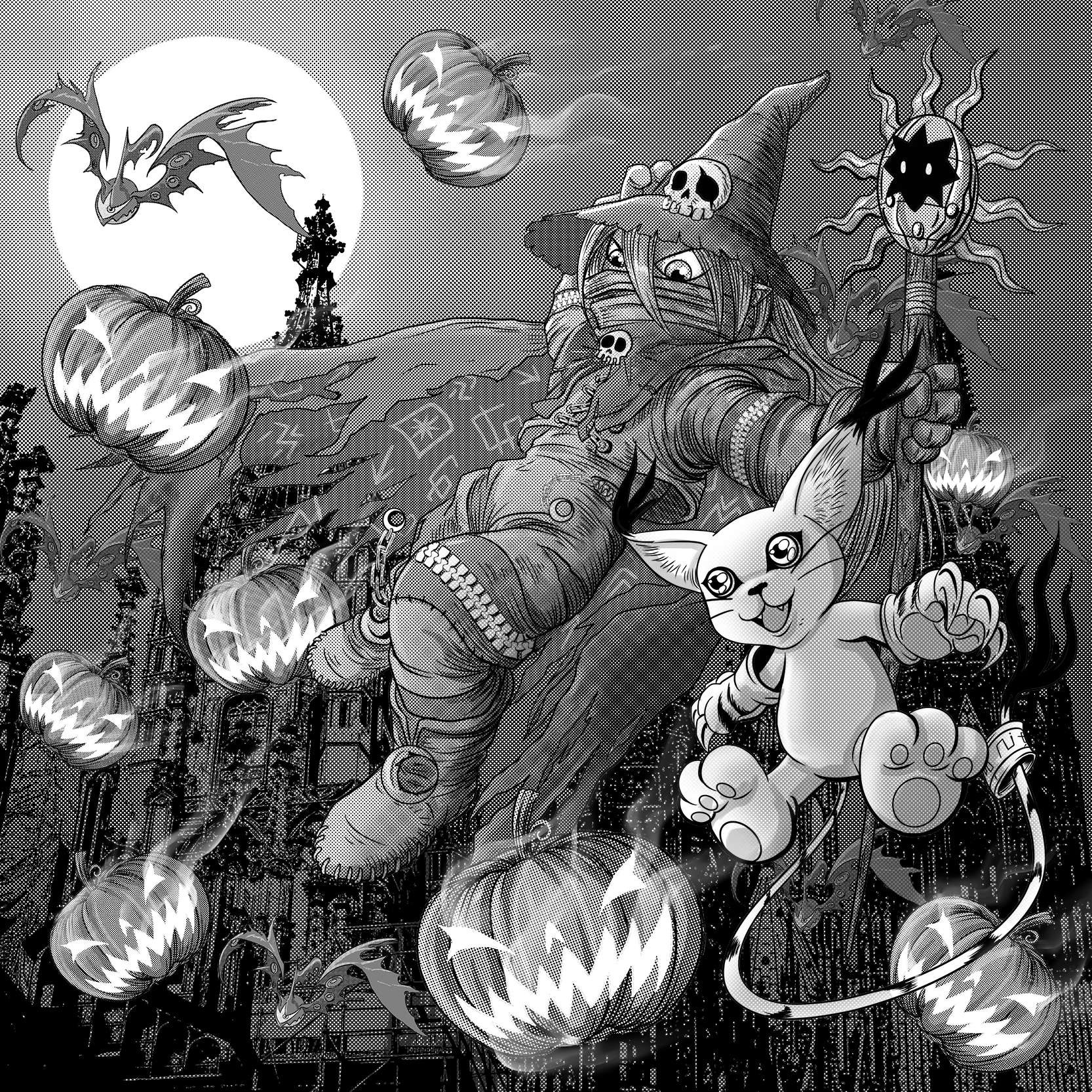 animal_ears cat cat_ears digimon digimon_(creature) gloves hat highres holy_ring skull soundbirdmon tail tailmon wizard wizard_hat wizarmon