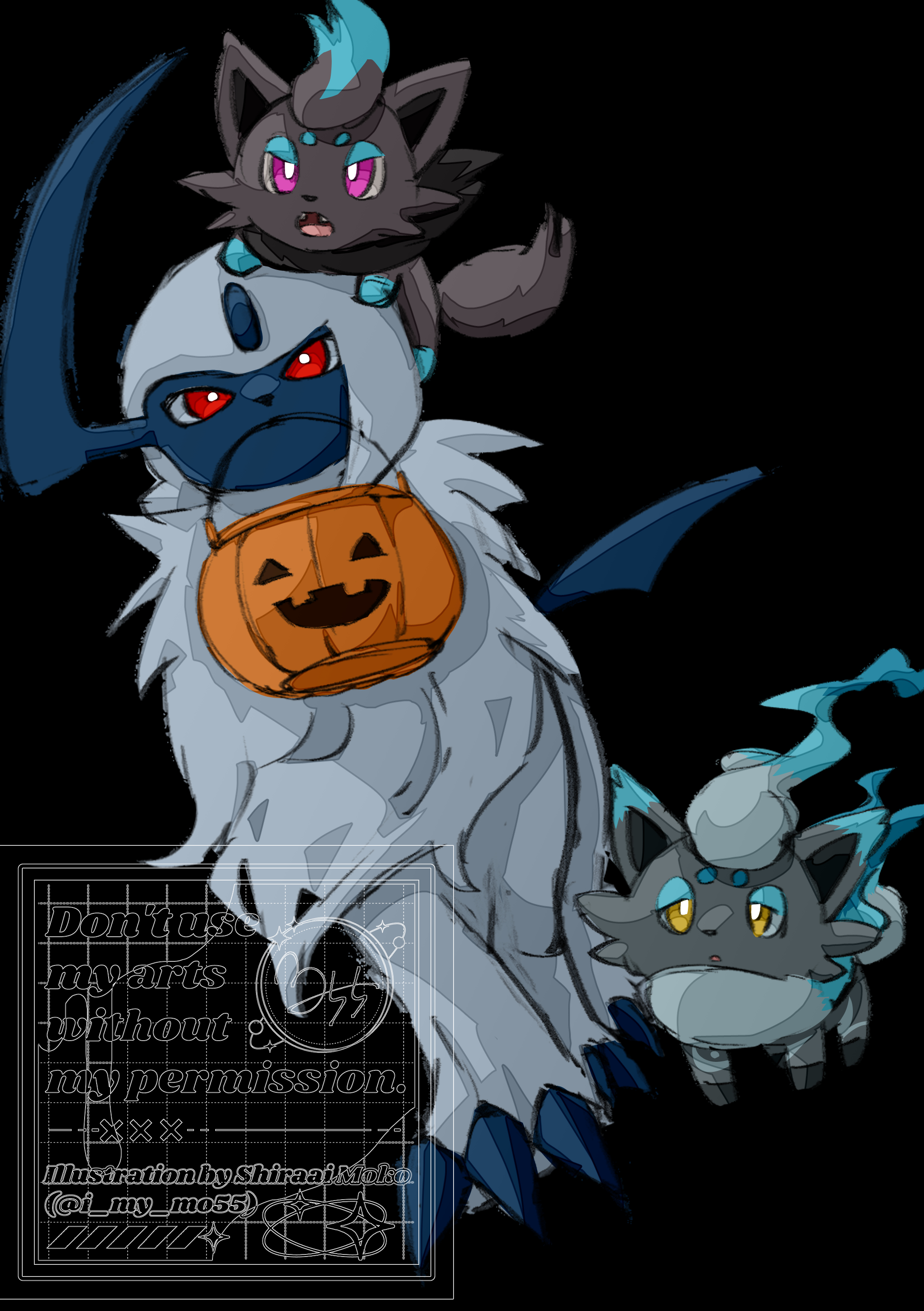 absol absurdres alternate_color animal_focus black_background blue_hair claws gen_3_pokemon gen_5_pokemon grey_hair halloween halloween_bucket highres hisuian_zorua horns i_my_mo55 mouth_hold multicolored_hair nintendo no_humans pokemon pokemon_(creature) red_eyes shiny_pokemon simple_background single_horn two-tone_hair walking white_hair yellow_eyes zorua