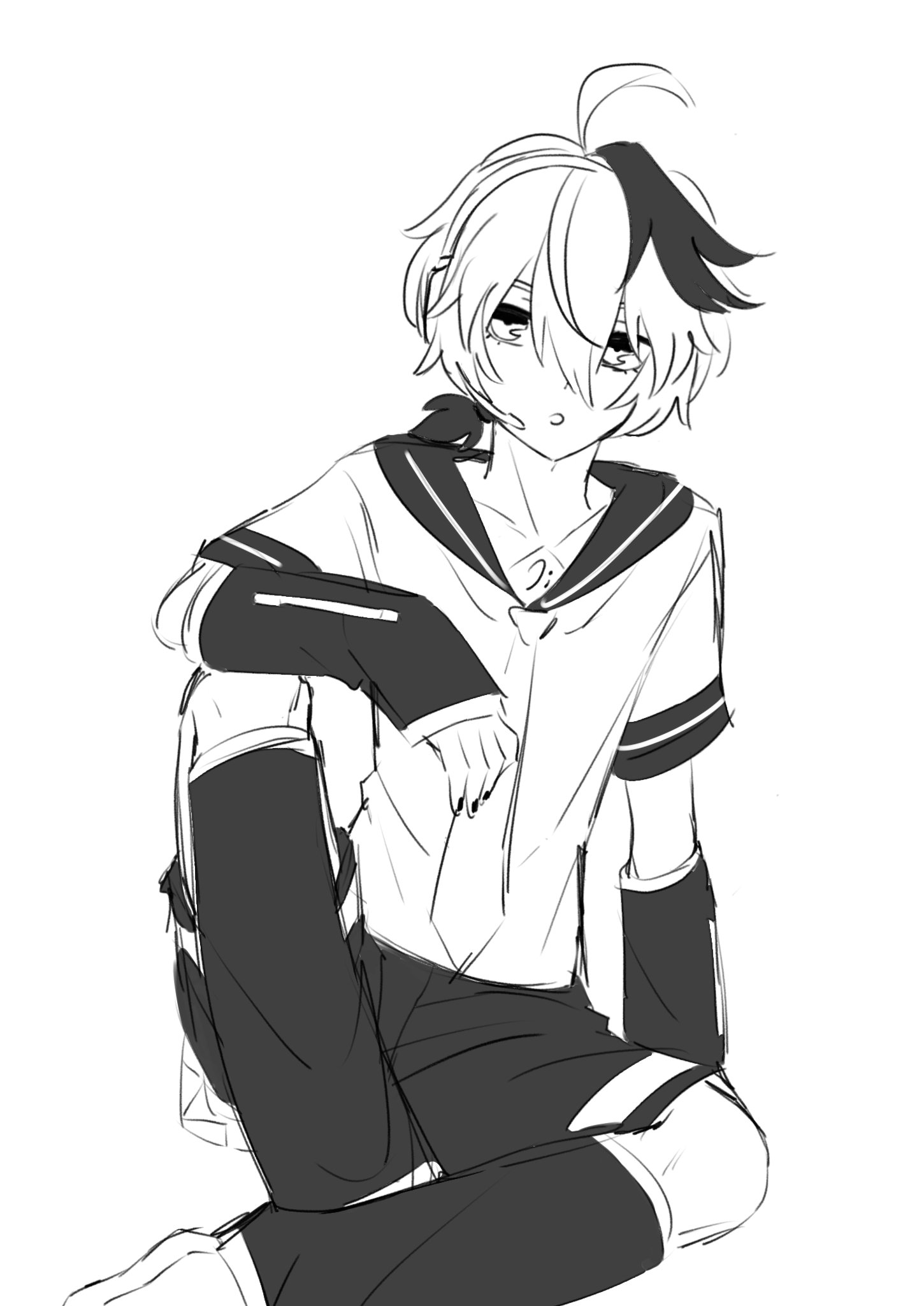 1girl :o ahoge androgynous arm_on_knee arm_warmers bass_clef commentary cosplay flower_(vocaloid) flower_(vocaloid4) greyscale headset highres kagamine_len kagamine_len_(cosplay) knee_up leg_warmers looking_at_viewer monochrome multicolored_hair musical_note musical_note_print nail_polish necktie parted_lips sailor_collar school_uniform short_hair short_sleeves shorts sitting solo streaked_hair untranslatable_commentary vflovver vocaloid