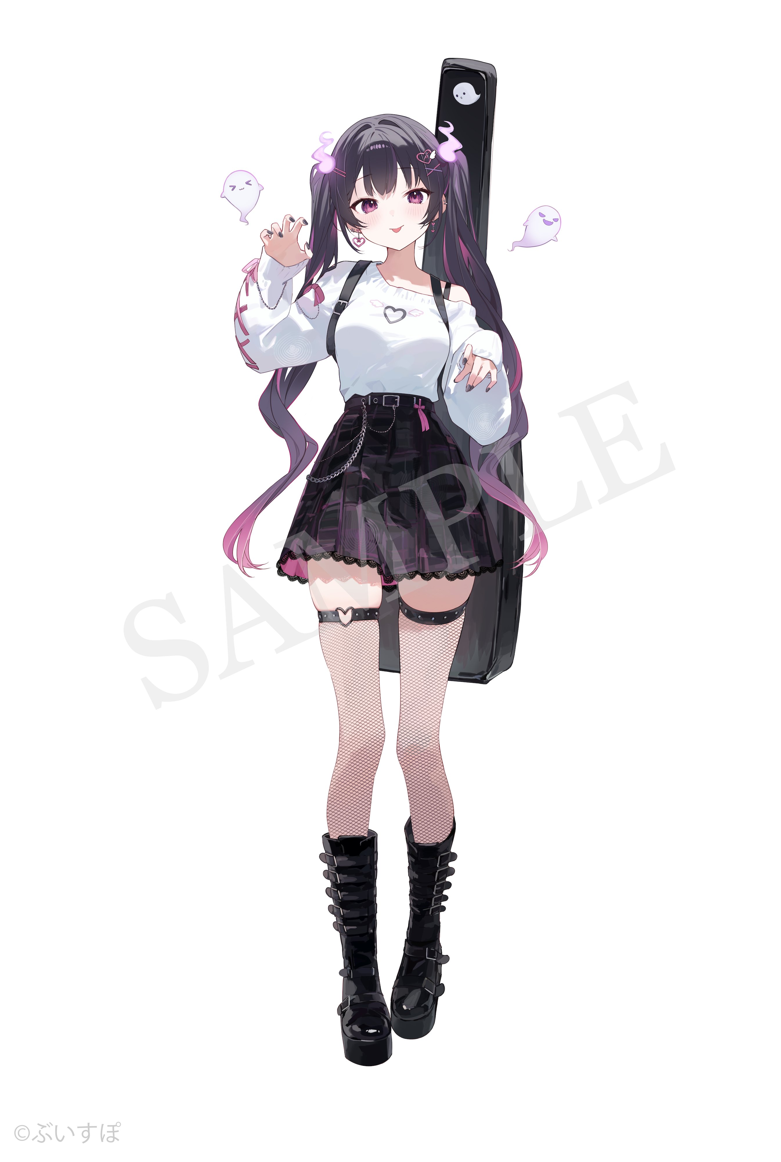1girl absurdres belt black_belt black_boots black_hair black_nails black_skirt boots breasts closed_mouth fishnet_thighhighs fishnets ghost hands_up highres knee_boots long_hair long_sleeves looking_at_viewer medium_breasts mikure_narin multicolored_hair pink_hair purple_hair sample_watermark shirt simple_background skirt smile solo soybean_(hisoybean) standing thigh_strap thighhighs tongue tongue_out twintails virtual_youtuber vspo! vspo!_en watermark white_background white_shirt