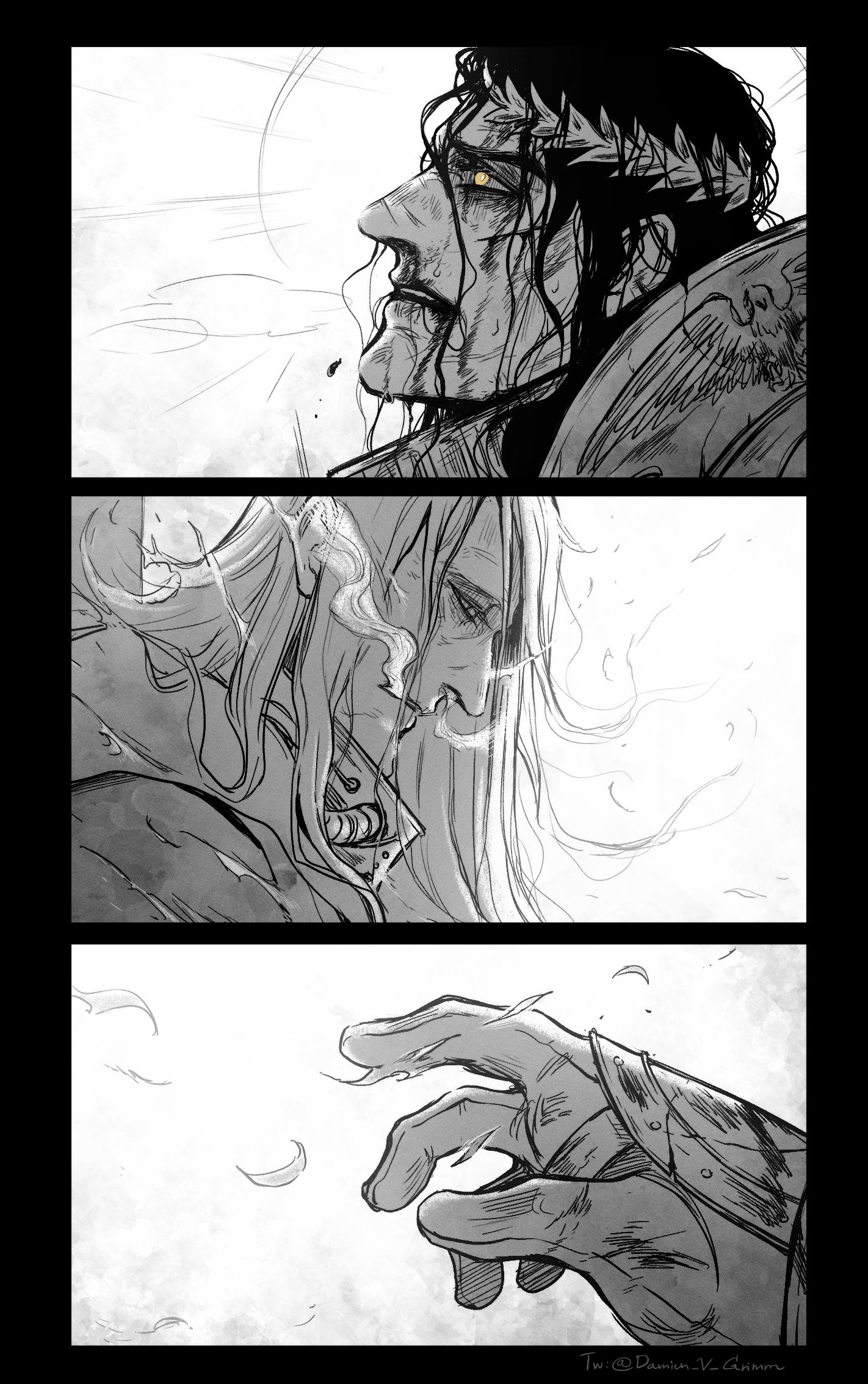 @_(symbol) armor artist_name black_border black_hair blood blood_from_mouth blood_on_face border commentary damien_v_grimm death emperor_of_mankind english_commentary gloves gorget greyscale highres laurel_crown laurels long_hair malcador_the_sigillite monochrome nosebleed pauldrons reaching reaching_towards_another sad self-sacrifice shoulder_armor steam breath steaming_body tube twitter_username warhammer_40k white_hair yellow_eyes