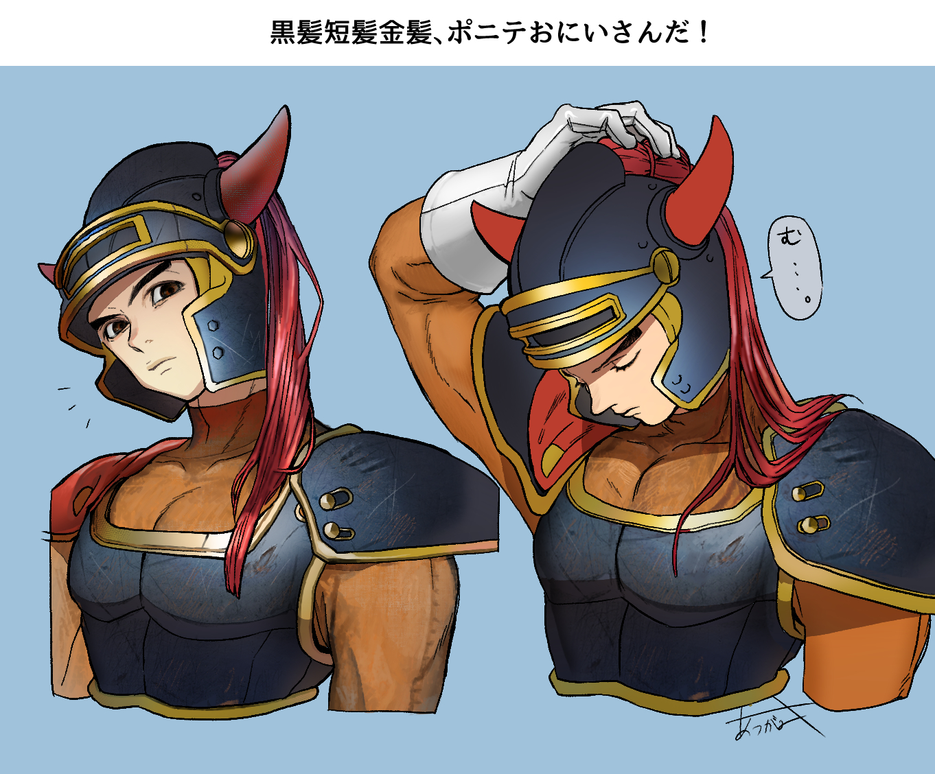 1boy aretokasoretoka armor black_eyes blue_armor bodysuit cape closed_eyes closed_mouth commentary_request covered_pectorals dragon_quest dragon_quest_i fake_horns gloves hand_on_headwear helmet hero_(dq1) horned_helmet horns looking_to_the_side male_focus multiple_views notice_lines orange_bodysuit pectorals red_cape signature speech_bubble toned toned_male translation_request upper_body white_gloves