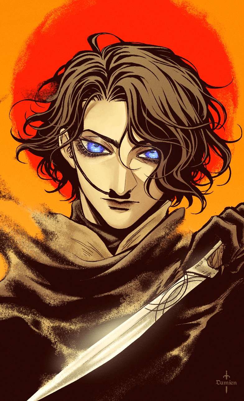 1boy artist_name blue_eyes brown_hair commentary crysknife damien_v_grimm dune_(series) english_commentary eyes_of_ibad gloves glowing glowing_eyes highres holding holding_knife knife looking_at_viewer male_focus medium_hair nose_tube paul_atreides signature solo stillsuit upper_body weapon
