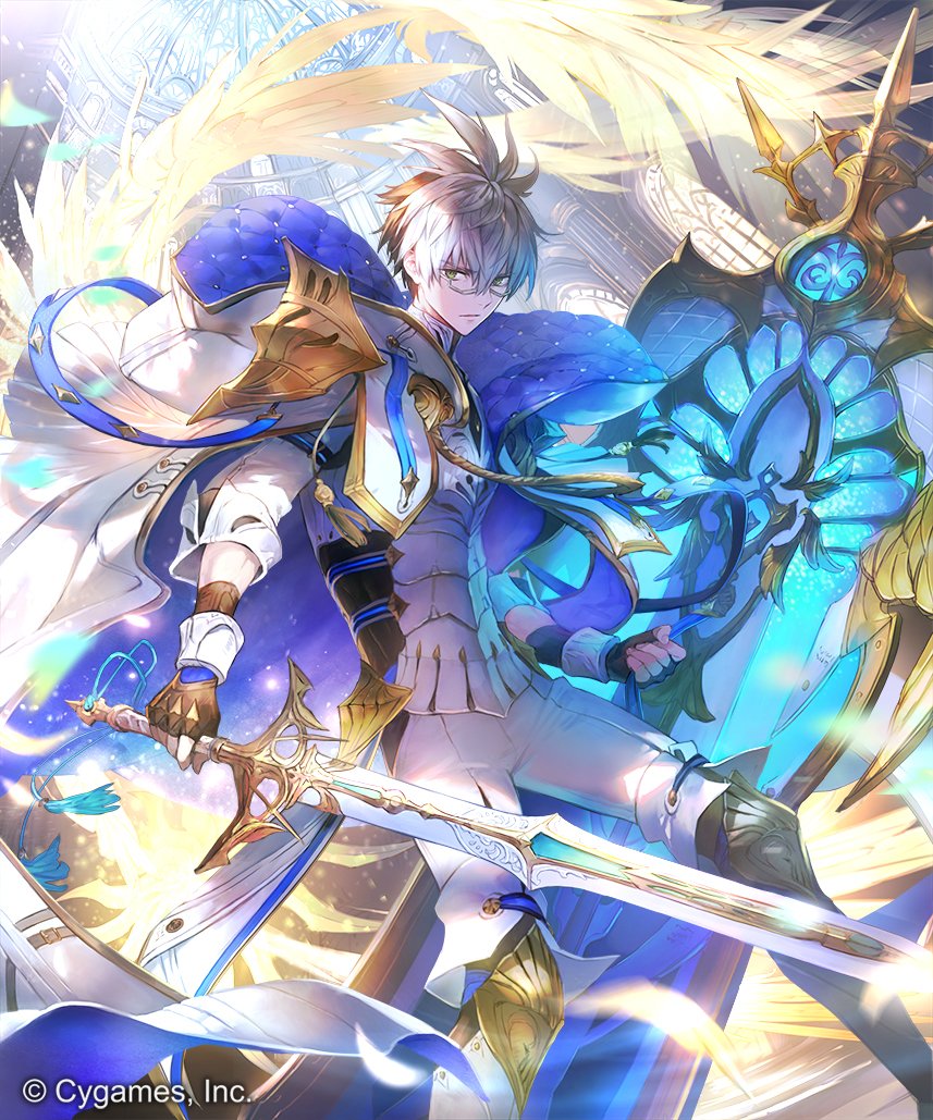 1boy ankle_boots armor black_hair black_shirt boots breastplate closed_mouth coat commentary_request company_name day dome feathered_wings feet_out_of_frame fingerless_gloves from_below glasses gloves green_eyes high_collar holding holding_shield holding_sword holding_weapon indoors knight light_particles light_rays long_coat looking_at_viewer male_focus mikebosi multicolored_hair official_art open_clothes open_coat pants shadowverse shield shirt shoulder_armor solo standing sword weapon white_boots white_coat white_hair white_pants wilbert_(shadowverse) window wings