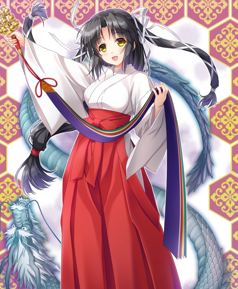1girl bell black_hair breasts dragon feet_out_of_frame hair_ribbon hakama honeycomb_(pattern) honeycomb_background japanese_clothes jingle_bell kagura_suzu kimizuka_aoi kimono long_hair looking_at_viewer low-tied_long_hair medium_breasts miko one_side_up original red_hakama ribbon smile solo white_kimono wide_sleeves yellow_eyes