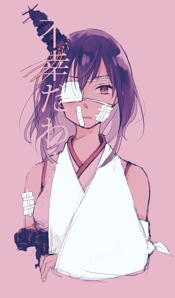 1girl arm_sling bandaid bandaid_on_face broken_arm commentary_request cropped_torso eyepatch floating_hair gauze gauze_on_arm gauze_on_cheek glaring headgear injury japanese_clothes kantai_collection kimono limited_palette looking_at_viewer medical_eyepatch medium_hair parted_lips pink_background purple_hair red_eyes scowl shironojiro simple_background sleeveless sleeveless_kimono solo translation_request upper_body v-shaped_eyebrows yamashiro_(kancolle)