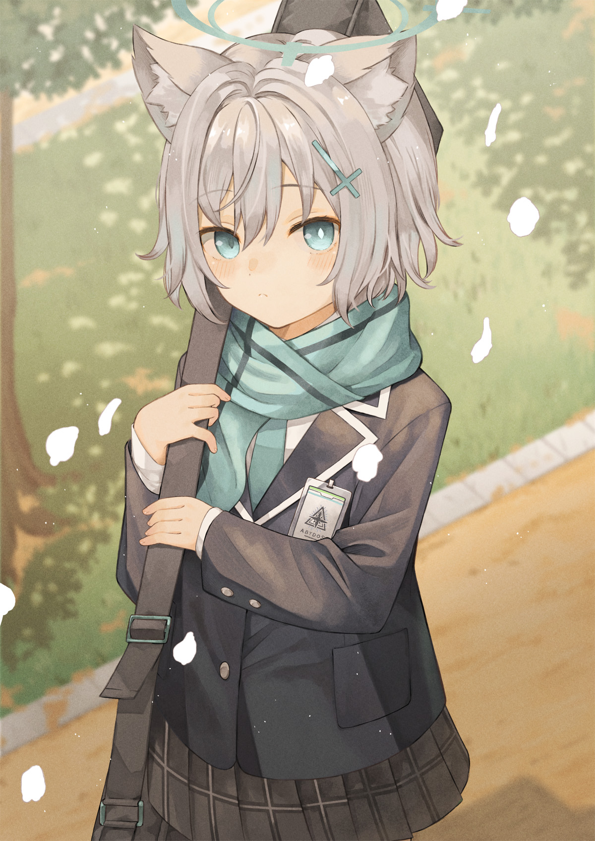 1girl animal_ear_fluff animal_ears aqua_necktie aqua_scarf bag black_jacket black_skirt blue_archive blue_eyes blue_halo blush bright_pupils buttons closed_mouth commentary cross_hair_ornament falling_petals grass grey_hair hair_ornament halo highres holding holding_bag id_card jacket mismatched_pupils necktie original-orange-610917 outdoors petals plaid_clothes plaid_skirt pleated_skirt pocket scarf school_uniform shiroko_(blue_archive) shiroko_(young)_(blue_archive) shirt short_hair skirt solo tree white_pupils white_shirt