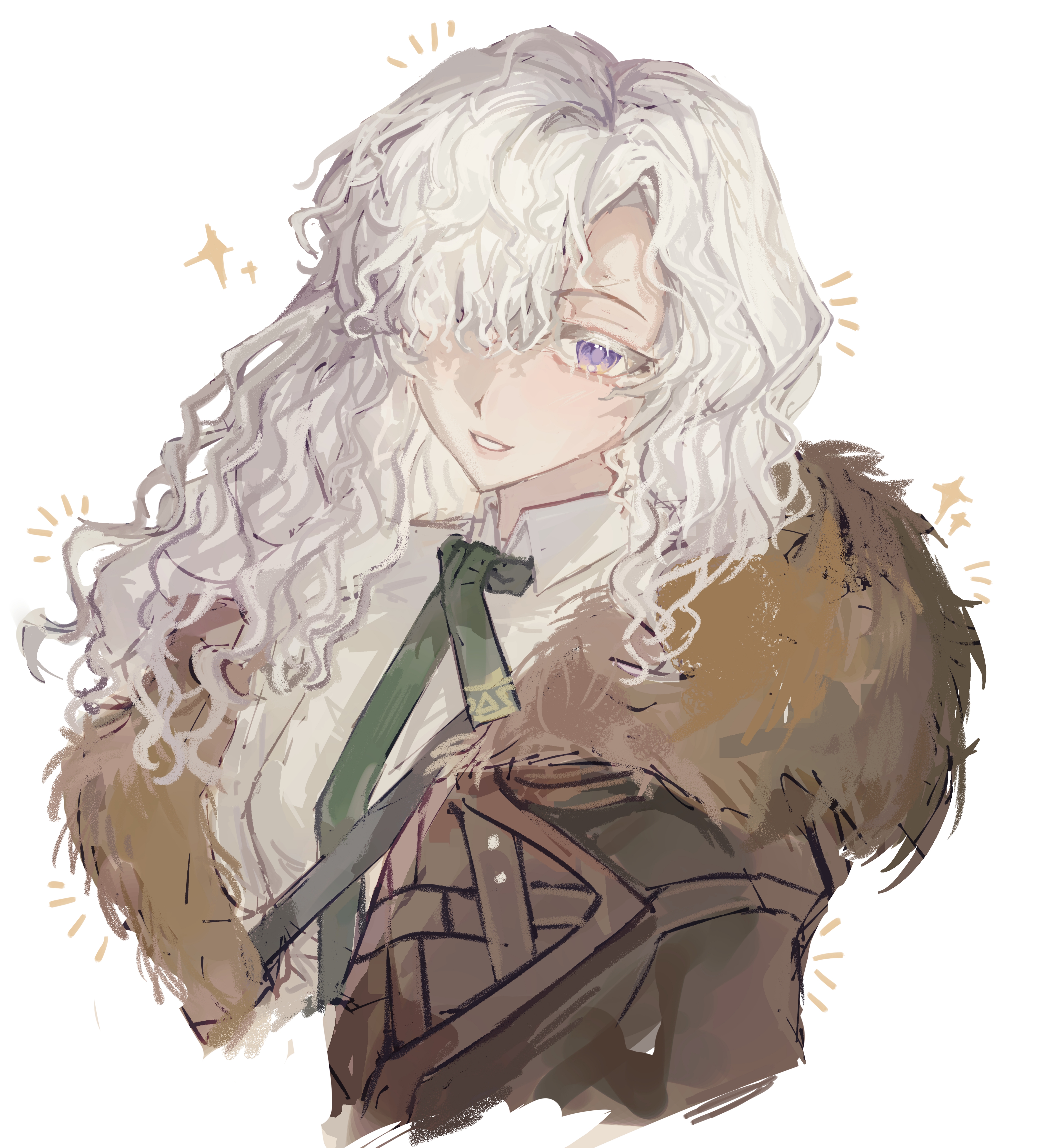 1girl absurdres brown_coat coat collared_shirt curly_hair fur-trimmed_coat fur_trim green_necktie grin hair_over_one_eye highres long_hair looking_at_viewer necktie one_eye_covered purple_eyes reverse:1999 sangyu-feiwan shirt smile solo sparkle upper_body white_background white_hair white_shirt windsong_(reverse:1999)
