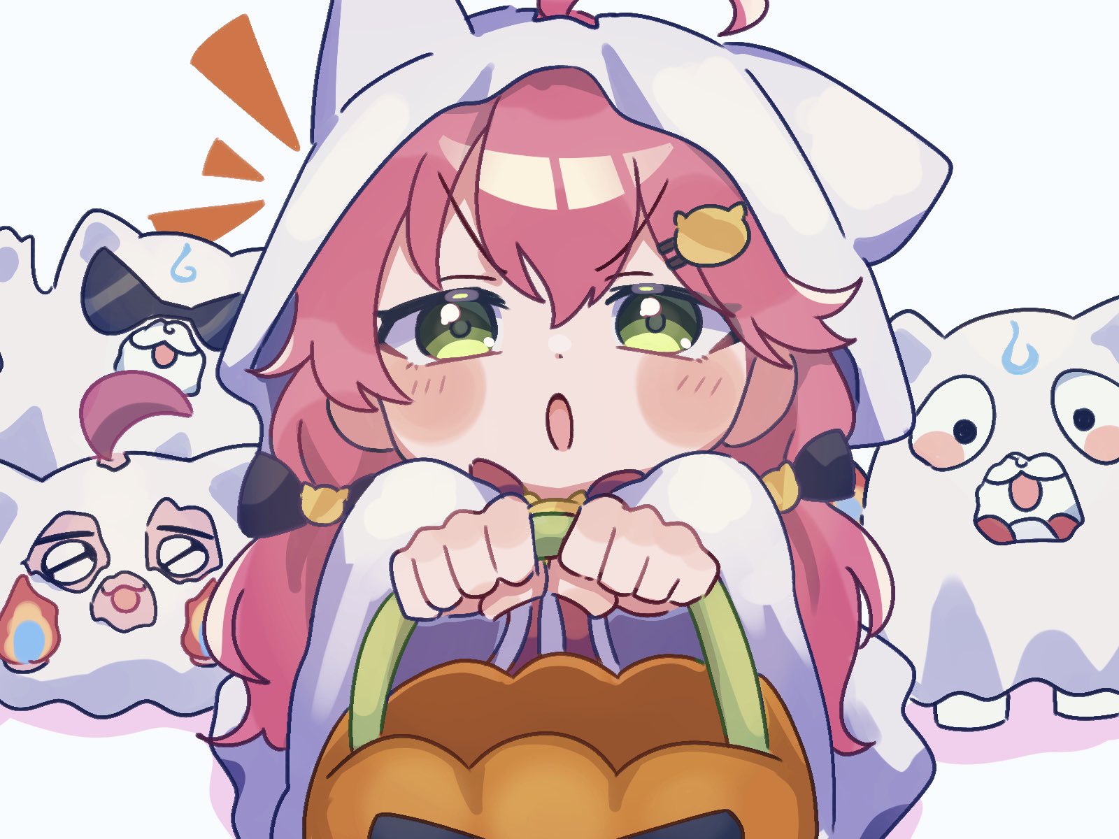 35p_(sakura_miko) :o ahoge alternate_costume animal_hood blush bucket cat_hood chibi cloak ghost_costume green_eyes hair_between_eyes hair_ornament hairclip halloween halloween_costume highres holding holding_bucket hololive hood hooded_cloak long_hair maguchi_(sakura_miko) notice_lines open_mouth pink_hair sakura_miko sheet_ghost standing sunglasses torn_clothes twintails v-shaped_eyebrows virtual_youtuber white_cloak zunda_mochi_(zundamochilala)