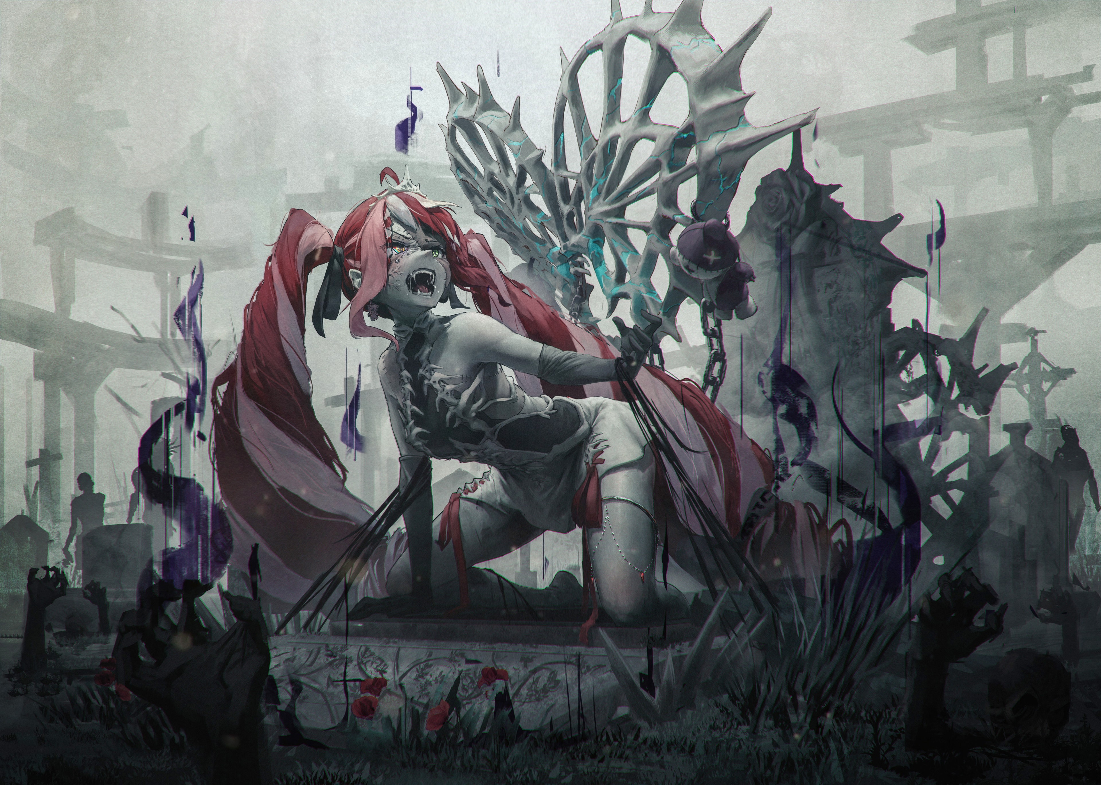 1girl absurdres chain colored_skin dress elbow_gloves fangs gloves graveyard grey_skin hair_ribbon heterochromia highres hololive hololive_indonesia kokono_ka kureiji_ollie kureiji_ollie_(rebirth) long_hair multicolored_hair open_mouth patchwork_skin red_hair ribbon solo_focus stitched_face stitched_torso stitches streaked_hair tiara tombstone twintails udin_(kureiji_ollie) very_long_hair virtual_youtuber white_dress zombie