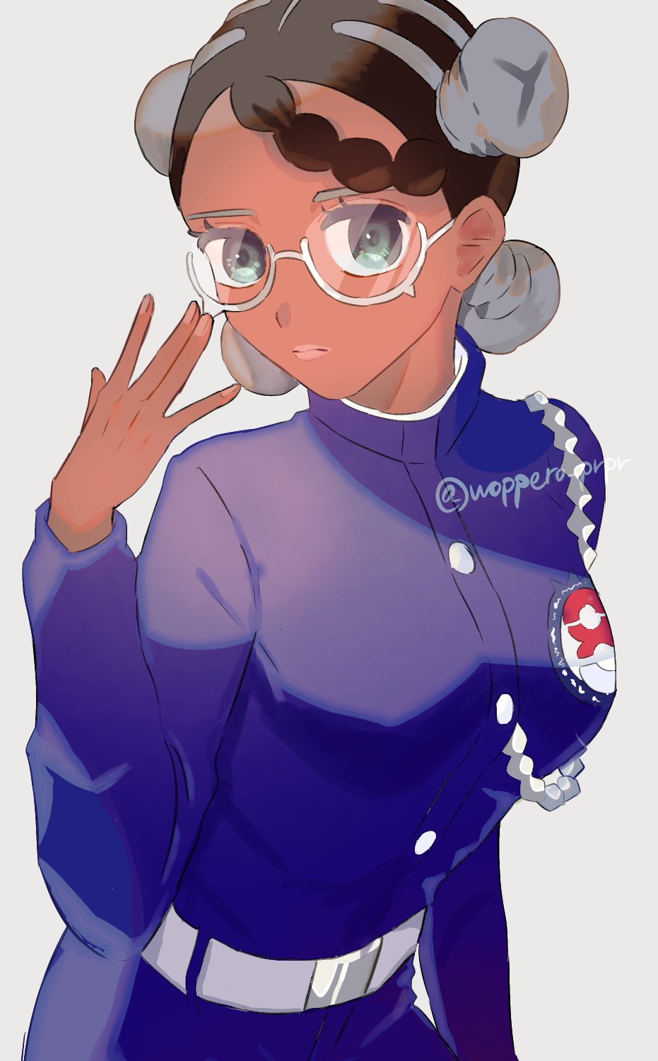 1girl amarys_(pokemon) belt belt_buckle blue_jacket blue_pants braid breasts buckle buttons chain closed_mouth commentary_request dark-skinned_male dark_skin eyelashes glasses hand_up highres jacket long_sleeves nintendo pants pokemon pokemon_sv short_hair solo white-framed_eyewear white_belt woppero_prpr