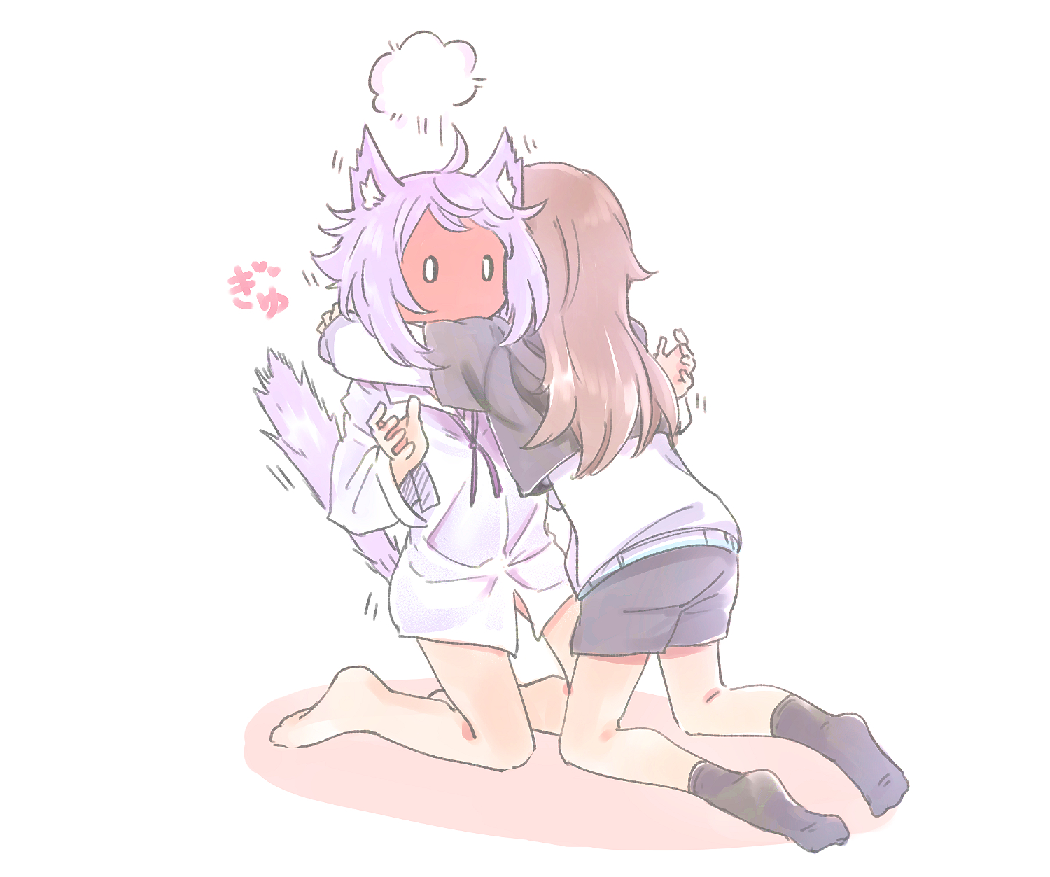 2girls ahoge animal_ears barefoot black_shorts black_socks blush brown_hair cat_ears cat_tail ds_(ndsl) full-face_blush highres hololive hug kneeling long_hair multiple_girls nekomata_okayu nekomata_okayu_(oversized_shirt) no_shoes purple_eyes purple_hair shirt shorts socks tail tokino_sora tokino_sora_(dj_hoodie) virtual_youtuber white_shirt