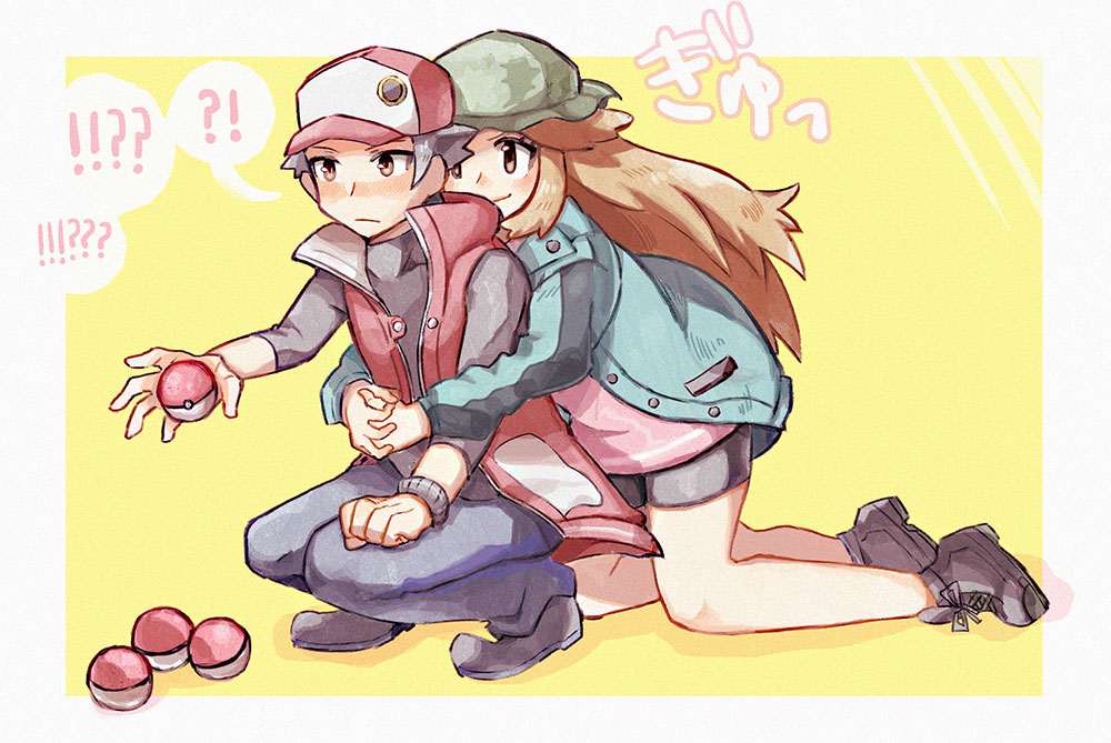 !? 1boy 1girl anidler91 baseball_cap bike_shorts black_footwear black_hair black_shorts blue_hat blue_jacket brown_eyes brown_hair camouflage_headwear closed_mouth coat frown hat holding holding_poke_ball hug hug_from_behind interlocked_fingers jacket kneeling leaf_(pokemon) leaf_(sygna_suit)_(pokemon) long_hair long_sleeves nintendo open_clothes open_jacket pink_shirt poke_ball poke_ball_(basic) pokemon pokemon_masters_ex red_(pokemon) red_(sygna_suit)_(pokemon) red_coat red_eyes shirt short_hair shorts sleeveless sleeveless_coat smile squatting