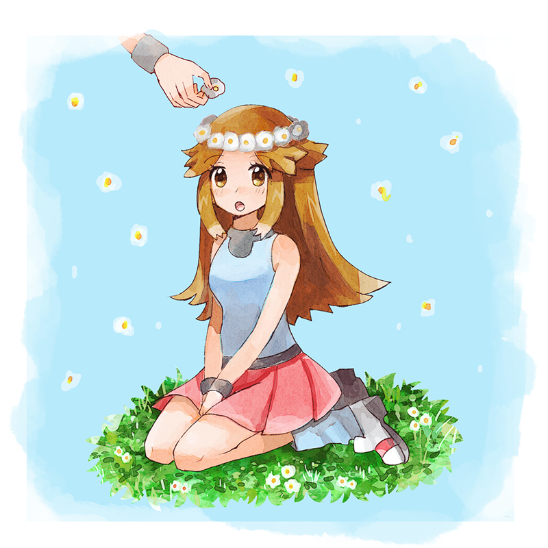 1girl :o anidler91 bare_shoulders blue_shirt blue_socks brown_eyes brown_hair flower grass head_wreath leaf_(pokemon) long_hair miniskirt nintendo on_ground open_mouth pokemon pokemon_firered_and_leafgreen red_skirt shirt shoes sitting skirt sleeveless sleeveless_shirt socks undershirt v_arms wariza white_flower white_footwear