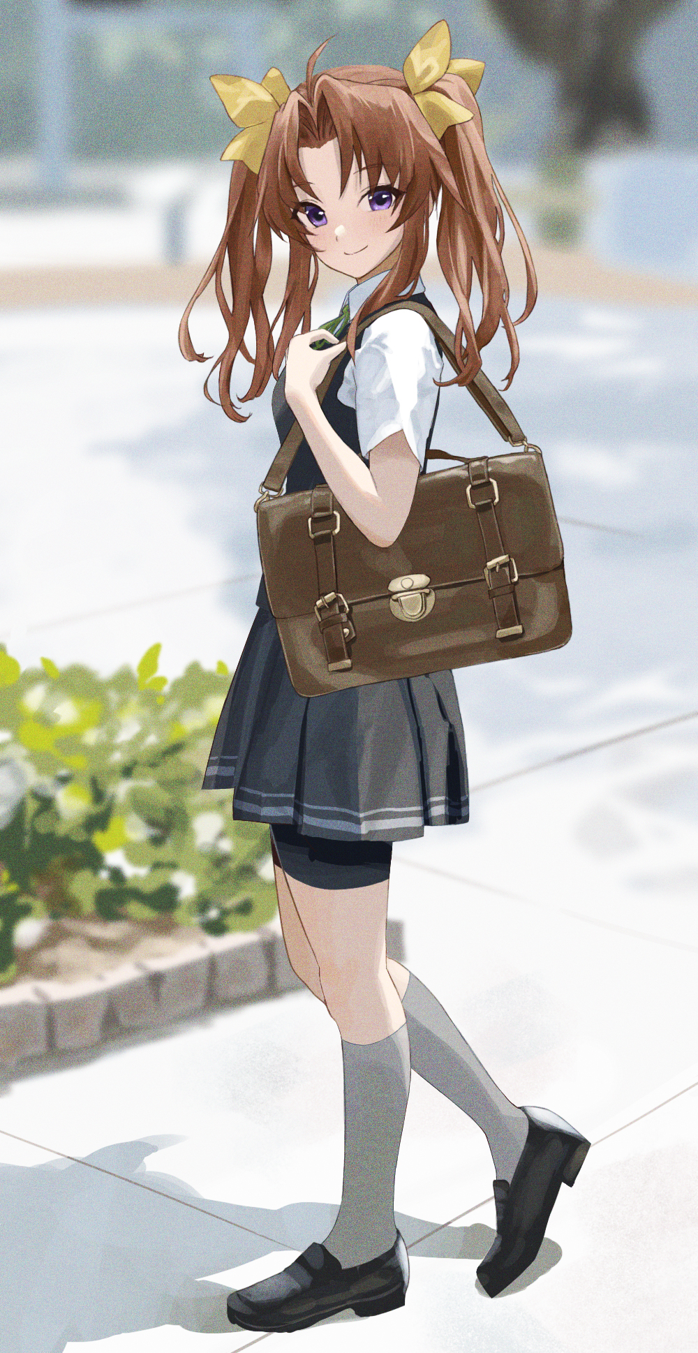 1girl ahoge bag bike_shorts brown_hair commentary_request commission from_side green_ribbon hair_ribbon highres hoshinopurin kagerou_(kancolle) kantai_collection long_hair looking_at_viewer looking_to_the_side neck_ribbon outdoors purple_eyes ribbon school_bag school_uniform shirt short_sleeves shorts shorts_under_skirt sideways_glance skeb_commission skirt smile solo twintails vest white_shirt yellow_ribbon