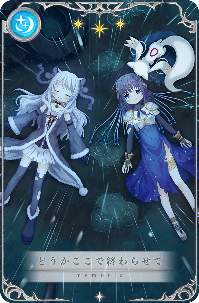 2girls arm_belt armor artist_request azusa_mifuyu bare_shoulders belt black_belt black_collar black_footwear black_gloves black_shirt blue_dress blue_eyes blue_gem blue_hair blue_ribbon boots bow bowtie breastplate bridal_gauntlets brooch brown_bridal_gauntlets brown_footwear buttons card_(medium) closed_eyes closed_mouth collar covered_navel crescent crescent_necklace crying defeat detached_sleeves disappointed dot_nose dress fluff from_above full_body fur-trimmed_boots fur-trimmed_dress fur-trimmed_sleeves fur_trim game_cg gem gloves gold_thighlet grey_bow grey_dress grey_sleeves grey_thighhighs hair_bow hair_horns hair_spread_out high_collar jewelry knees kyubey light_frown long_sleeves looking_at_viewer lying magia_record:_mahou_shoujo_madoka_magica_gaiden magical_girl mahou_shoujo_madoka_magica medium_dress medium_hair miniskirt multiple_girls nanami_yachiyo neck_ribbon necklace night official_alternate_hair_length official_alternate_hairstyle official_art on_back open_door open_mouth outdoors pauldrons picture_frame pink_bow pink_bowtie pleated_skirt pom_pom_(clothes) puddle rain ribbon ripples sad sandals shirt shoulder_armor side_slit sidelocks skirt sleeveless sleeveless_dress sleeves_past_wrists star_(symbol) star_print streaming_tears string tears thighhighs thighlet toes torn_clothes torn_dress torn_sleeves torn_thighhighs translated tsurime turtleneck turtleneck_shirt veil wavy_hair white_hair white_skirt white_veil