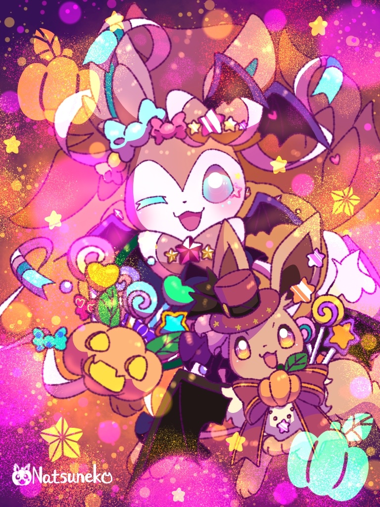 artist_name blush bow candy candy_wrapper eevee evolutionary_line food gen_1_pokemon gen_6_pokemon halloween halloween_costume jack-o'-lantern lollipop looking_at_viewer natsuneko nintendo pokemon pokemon_(creature) pumpkin ribbon smile star_(symbol) sylveon