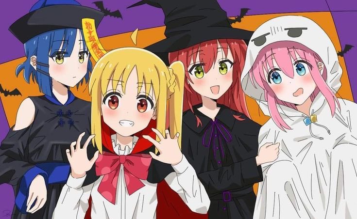 4girls animal_print bat_print black_cape black_hat black_robe blonde_hair blue_eyes blue_hair bocchi_the_rock! bow cape cube_hair_ornament ghost_costume gotoh_hitori green_eyes hair_ornament halloween halloween_costume hat hood hoodie ijichi_nijika jiangshi_costume kita_ikuyo long_hair looking_at_viewer mgmgcomecome multiple_girls ofuda orange_eyes pink_hair polka_dot polka_dot_bow ponytail red_hair robe sidelocks simple_background smile uneven_bangs vampire_costume white_hoodie witch witch_hat yamada_ryo yellow_eyes