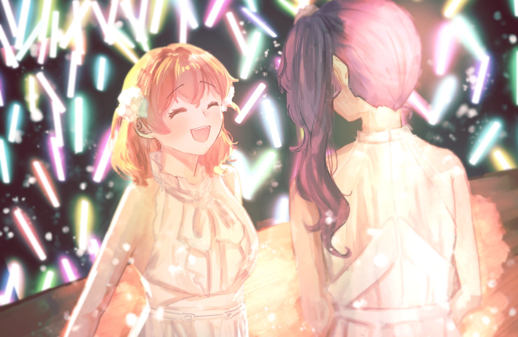 2girls :d ^_^ cerise_bouquet closed_eyes commentary crossed_bangs dress facing_another frilled_dress frills glowstick hair_bun hashtag-only_commentary highres hinoshita_kaho light_particles link!_like!_love_live! link_to_the_future_(love_live!) lone_nape_hair long_hair love_live! medium_hair mochi_(eaim88mi) multiple_girls official_alternate_costume open_mouth orange_hair otomune_kozue penlight_(glowstick) purple_hair side_ponytail sidelocks single_side_bun sleeveless sleeveless_dress smile stage two_side_up upper_body virtual_youtuber white_dress