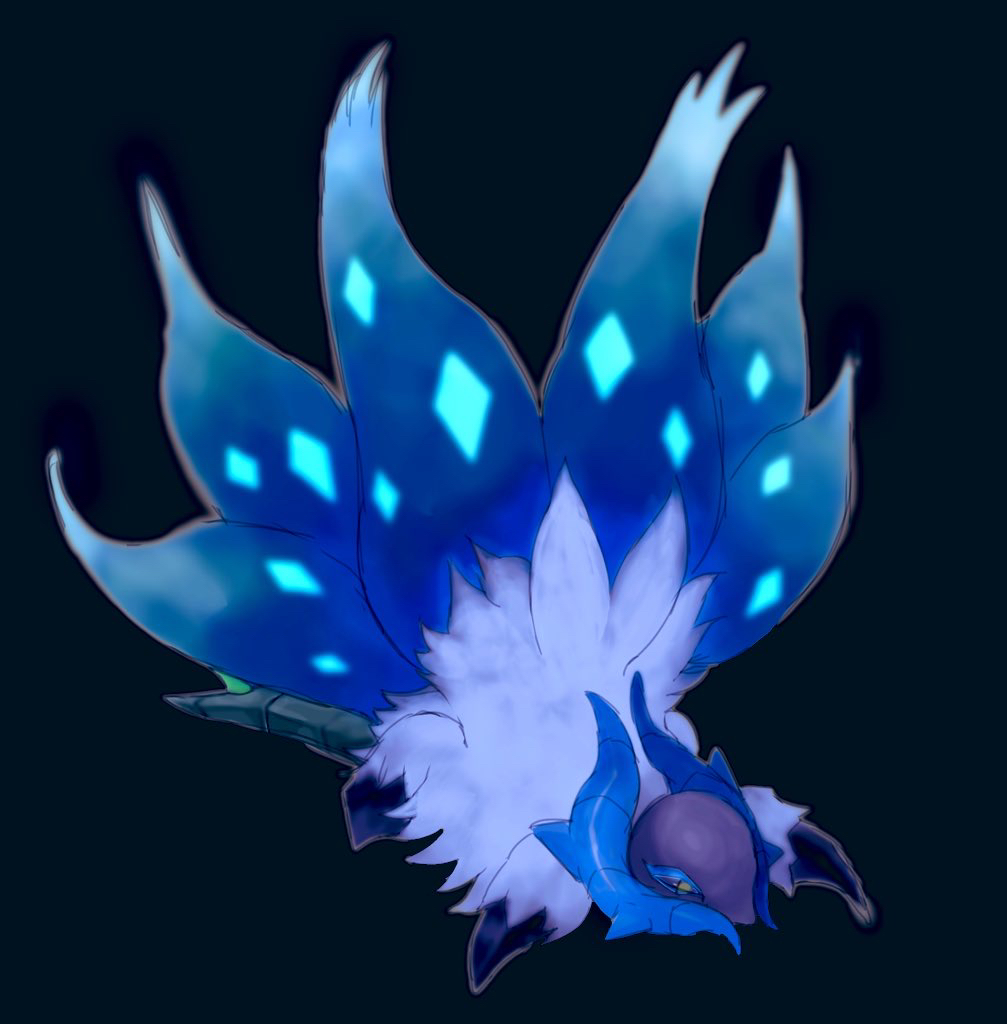 alternate_color animal_focus black_background blue_eyes blue_theme blurry depth_of_field fluffy full_body lying multicolored_eyes nintendo no_humans on_stomach pokemon pokemon_(creature) rey_(pixiv_95560830) shiny_pokemon simple_background sketch slither_wing solo yellow_eyes