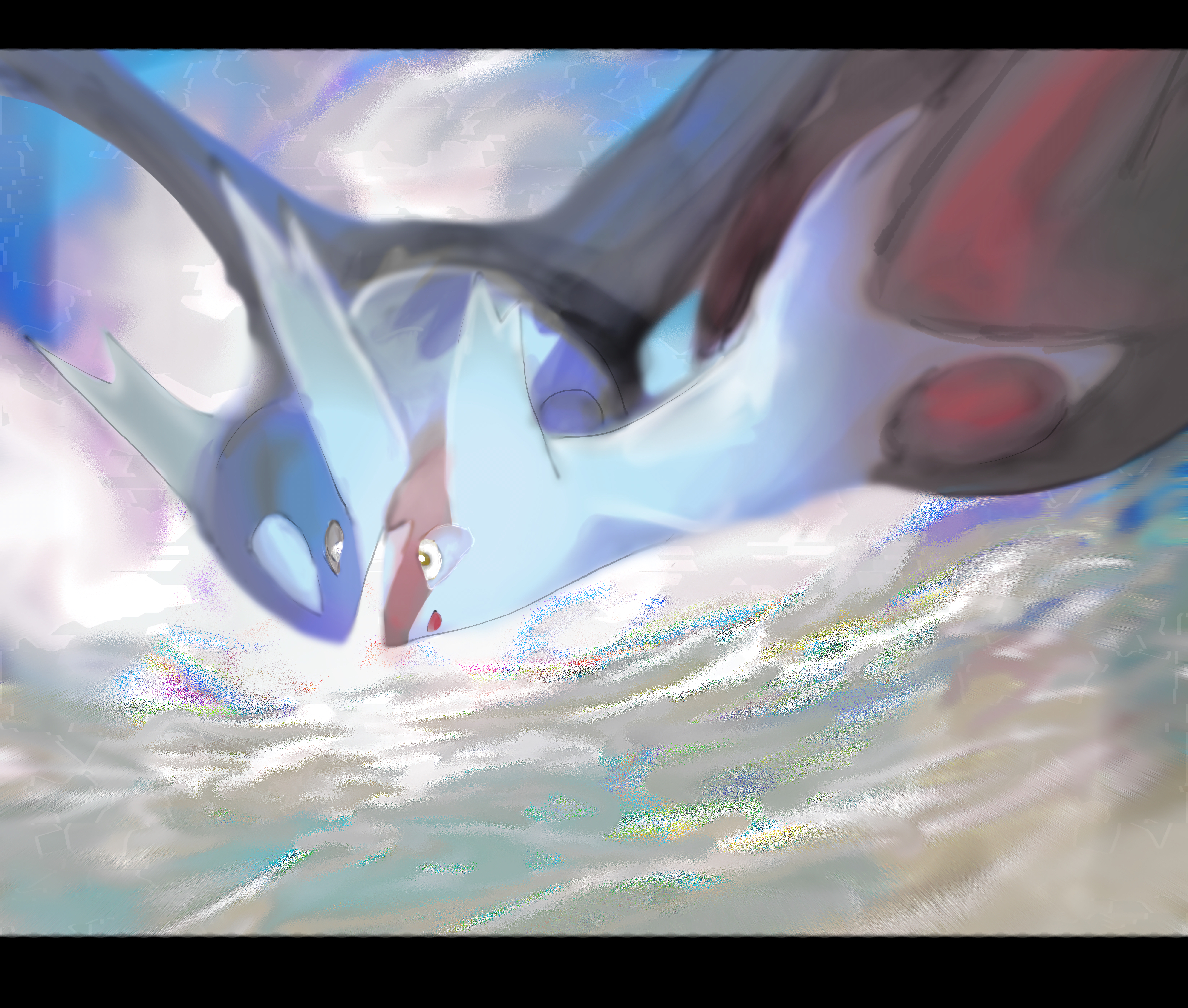 above_clouds absurdres animal_focus blurry cloud day depth_of_field dragon flying from_side gen_3_pokemon happy highres latias latios legendary_pokemon letterboxed nintendo no_humans open_mouth outdoors pokemon pokemon_(creature) profile rey_(pixiv_95560830) smile yellow_eyes