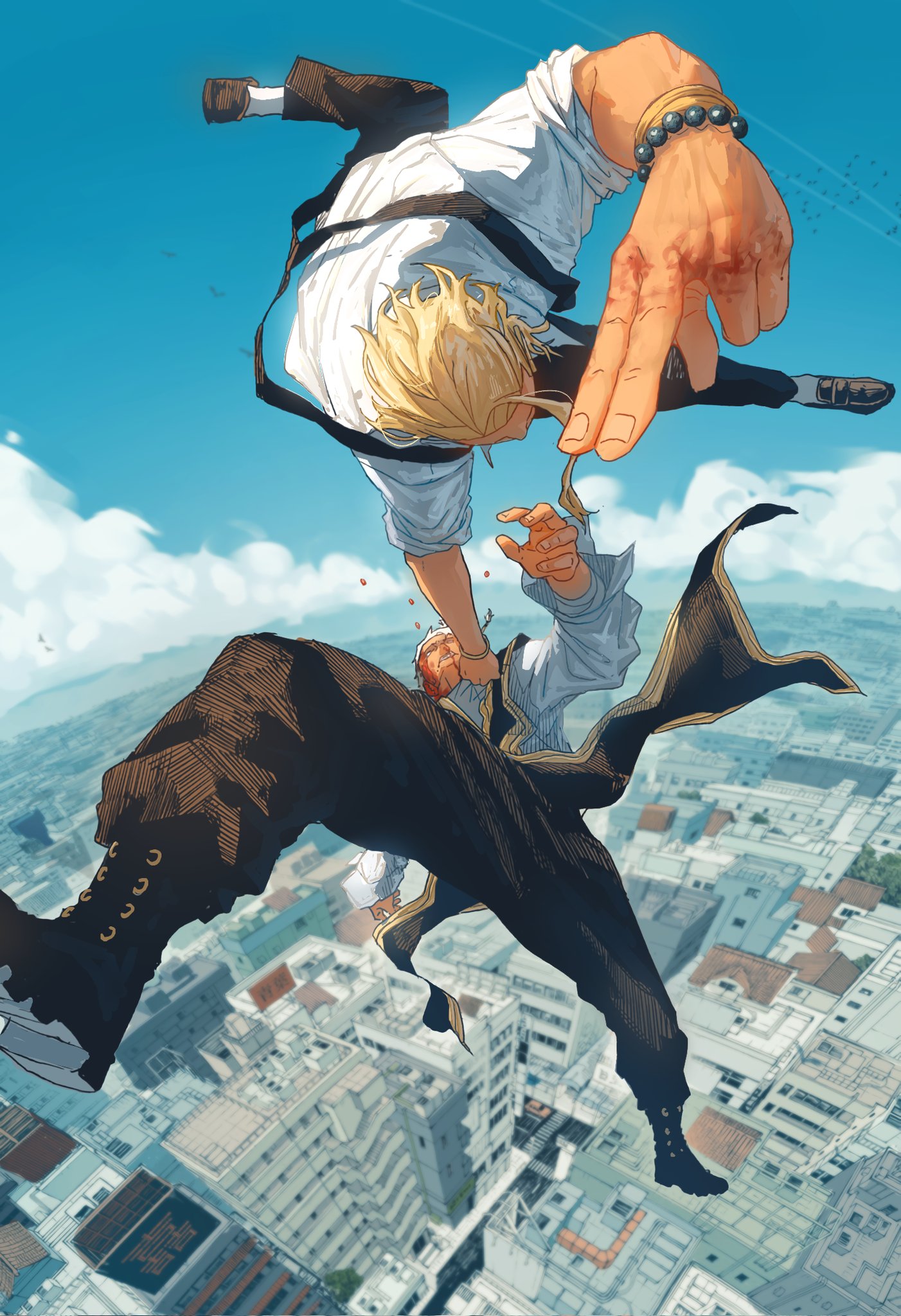 2boys black_footwear black_pants blonde_hair blood blood_on_face blood_on_hands blurry blurry_background boots building car character_request cloud day eliasdessin falling from_above highres kagurabachi long_sleeves male_focus motor_vehicle multiple_boys outdoors pants rooftop sazanami_souya shiba_tougo shirt short_hair sky white_hair white_shirt