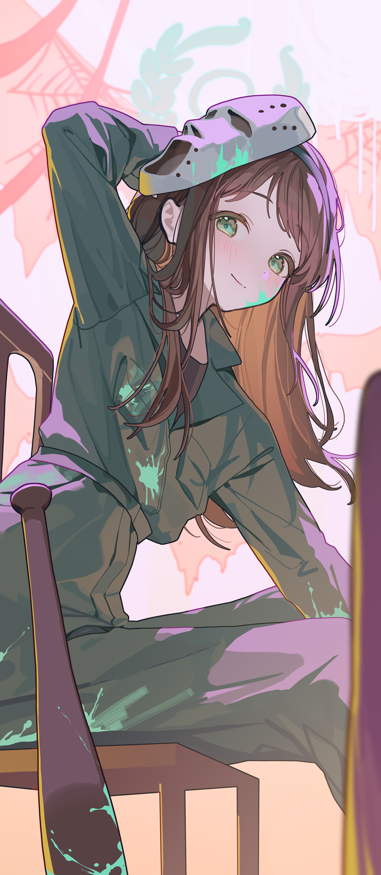 1girl airi_(blue_archive) airi_(halloween)_(blue_archive) aqua_eyes aqua_halo arm_behind_head arm_up baseball_bat black_jumpsuit blue_archive blurry blush brown_hair chair closed_mouth commentary_request depth_of_field dot_nose halo highres holding jumpsuit long_hair looking_at_viewer mask mask_on_head ningen_mame official_alternate_costume on_chair paint_splatter paint_splatter_on_face sitting smile solo undershirt