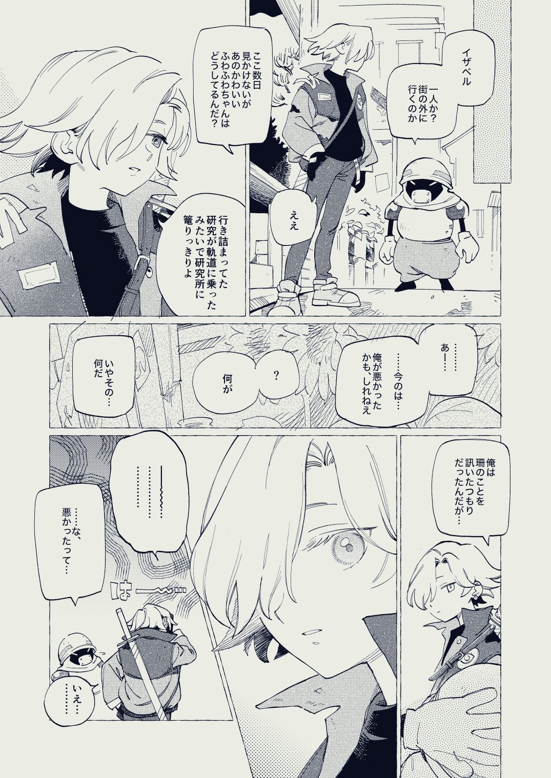 ... 1girl character_request city coat collared_coat colored_eyelashes day denim eastward expressionless eye_print from_behind gloves hair_over_one_eye hand_on_own_hip helmet highres isabel_(eastward) jeans katana lapels long_sleeves multiple_views no+bi= notched_lapels open_clothes open_coat outdoors pants parted_lips patch robot scratching_head shoes short_hair sidewalk sneakers spoken_ellipsis standing surprised sword sword_on_back weapon weapon_on_back