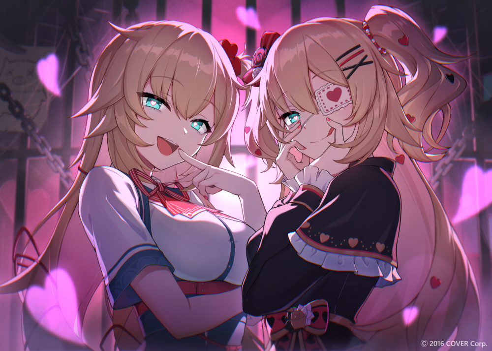 2girls :d :q akai_haato akai_haato_(1st_costume) akai_haato_(gothic_lolita) aqua_eyes black_capelet black_coat blonde_hair blue_skirt blurry blurry_background bow breasts capelet closed_mouth coat collared_shirt commentary_request copyright_notice doppelganger dual_persona eyepatch frilled_capelet frills gothic_lolita hair_between_eyes hair_bow hair_ornament hair_ribbon hairclip hands_on_own_face heart heart-shaped_pupils heart_hair_ornament high-waist_skirt hololive large_breasts lolita_fashion long_hair long_sleeves looking_at_viewer multiple_girls nail_polish neck_ribbon official_alternate_costume official_alternate_hairstyle official_art one_side_up open_mouth pink_nails red_ribbon ribbon shirt short_sleeves skirt smile symbol-shaped_pupils teeth tokisaka_makoto tongue tongue_out two_side_up upper_body upper_teeth_only very_long_hair virtual_youtuber white_shirt x_hair_ornament