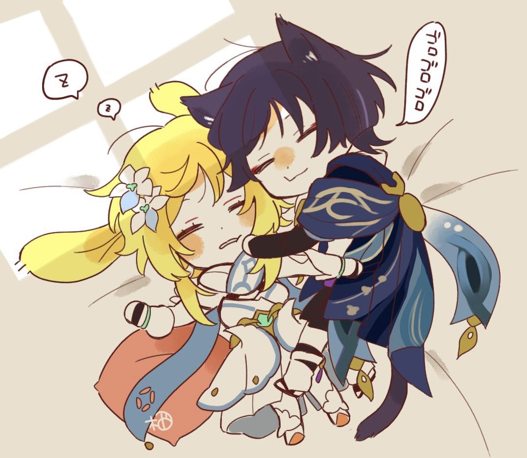 1boy 1girl animal_ears animal_print aqua_flower bird_print black_footwear black_hair black_socks blonde_hair blue_cape blue_scarf blue_trim blunt_ends blush bridal_gauntlets cape cat_ears cat_tail cheek_bulge chibi closed_eyes closed_mouth detached_sleeves dress eyelashes eyeliner eyeshadow fingerless_gloves flower genshin_impact gloves gold gold_trim hair_flower hair_ornament halterneck heads_together hetero hug hug_from_side leg_warmers lumine_(genshin_impact) lying makeup multicolored_flower on_back on_side parted_lips pillow rabbit_ears red_eyeliner red_eyeshadow sandals scaramouche_(genshin_impact) scarf short_hair short_hair_with_long_locks sidelocks skirt sleeping smile socks speech_bubble spoken_letter sumika_nl tail thighhighs toeless_footwear translation_request unconscious wanderer_(genshin_impact) white_dress white_flower white_footwear white_leg_warmers white_mouth white_scarf white_skirt white_thighhighs white_trim zouri
