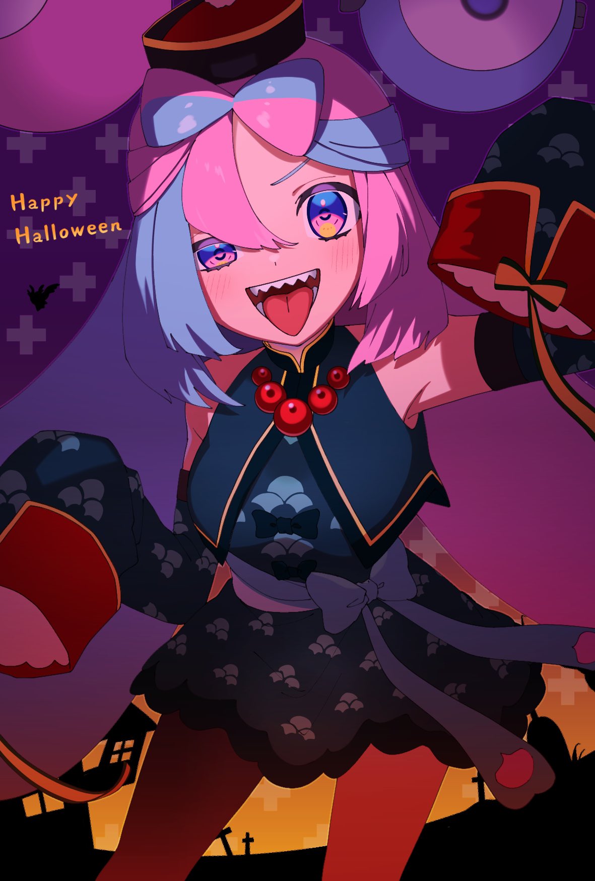 1girl blue_hair bow-shaped_hair detached_sleeves dress english_text flutter_mane hair_between_eyes happy_halloween hat highres iono_(fall_2024)_(pokemon) iono_(pokemon) jiangshi_costume long_hair long_sleeves looking_at_viewer multicolored_hair nintendo nisanrei121 official_alternate_costume pantyhose pink_eyes pink_hair pokemon pokemon_masters_ex sharp_teeth sleeves_past_fingers sleeves_past_wrists solo teeth tongue tongue_out twintails two-tone_hair very_long_hair