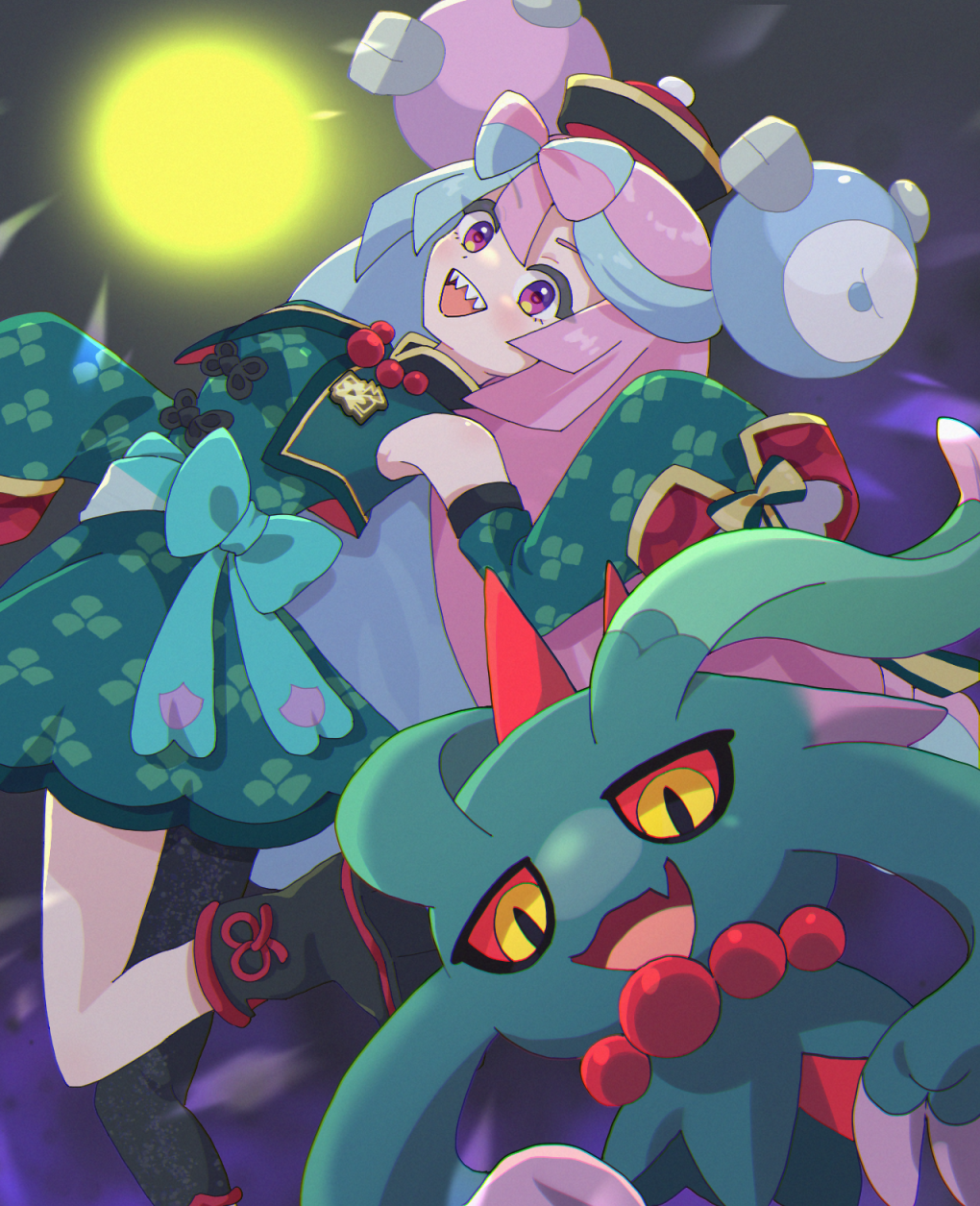 1girl :d beads black_footwear boots bow bow-shaped_hair character_hair_ornament commentary_request detached_sleeves dress flutter_mane green_dress hair_ornament happy hat highres iono_(fall_2024)_(pokemon) iono_(pokemon) multicolored_hair nintendo niwaniha0711 official_alternate_costume open_mouth pokemon pokemon_(creature) pokemon_masters_ex smile teeth two-tone_hair upper_teeth_only