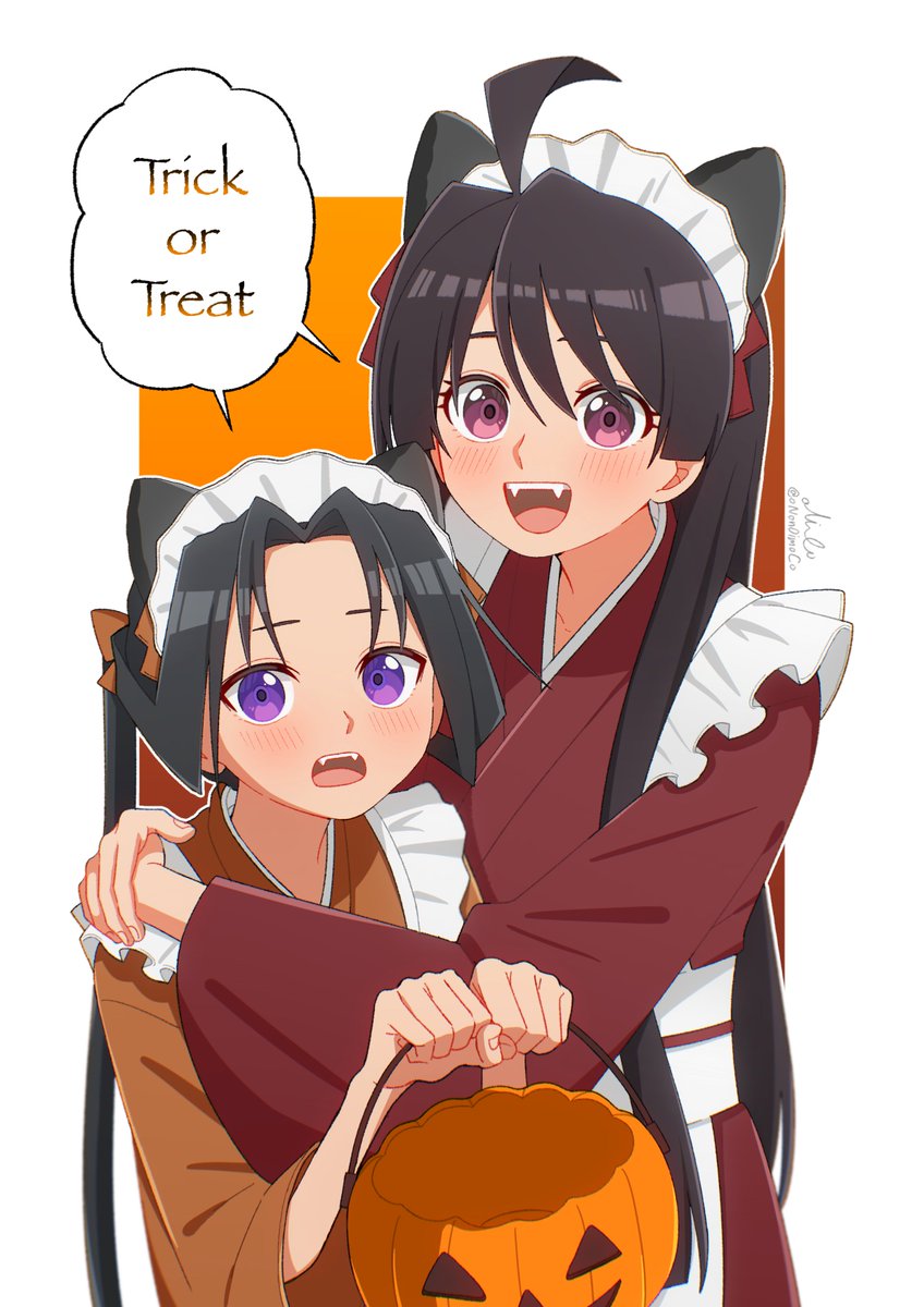 1boy 1girl :d ahoge alternate_costume animal_ears apron arm_around_shoulder black_hair blush border bow bucket cat_boy cat_ears cat_girl curtained_hair fangs frilled_apron frills hair_between_eyes hair_bow halloween_bucket halloween_costume hands_up highres holding holding_bucket holding_halloween_bucket houjou_tokiyuki_(nige_jouzu_no_wakagimi) hug japanese_clothes kimono long_hair looking_at_viewer maid maid_apron maid_headdress mochizuki_ayako nige_jouzu_no_wakagimi obi obijime onon0imoco open_mouth orange_background orange_bow orange_kimono outside_border parted_bangs pink_eyes ponytail purple_eyes raised_eyebrows red_kimono sash sidelocks_tied_back signature smile trick_or_treat twitter_username very_long_hair wa_maid white_border wide-eyed
