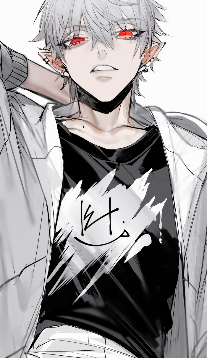 1boy arm_behind_head au_(d_elete) black_shirt collarbone commentary_request earrings grey_hair grimace hair_between_eyes highres jewelry kuzuha_(nijisanji) long_eyelashes long_sleeves looking_at_viewer male_focus mole mole_under_eye nijisanji partial_commentary pointy_ears red_eyes shirt solo t-shirt upper_body virtual_youtuber