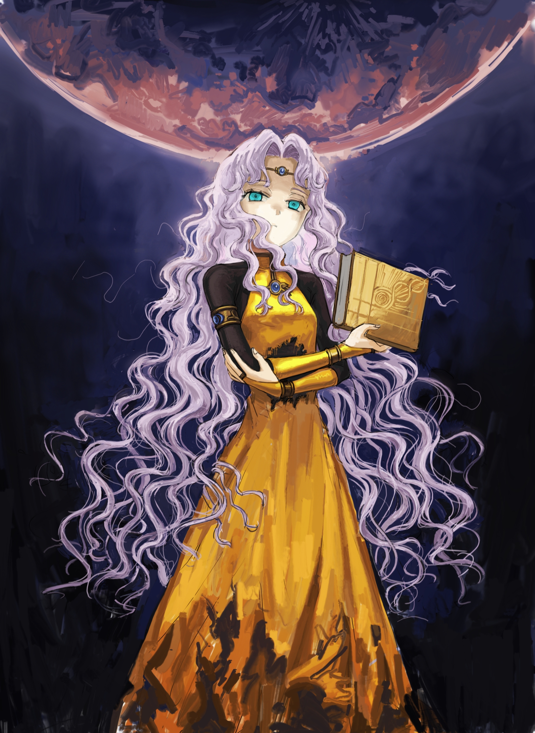1girl book circlet closed_mouth crossed_arms dress fire_emblem fire_emblem:_thracia_776 green_eyes hands_up highres holding holding_book jewelry long_hair looking_at_viewer moon nintendo parted_bangs purple_hair sallow_artist sara_(fire_emblem) shaded_face solo very_long_hair wavy_hair yellow_dress