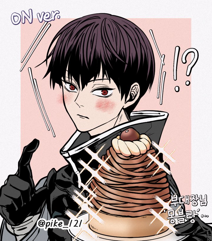 1boy black_hair blush closed_mouth food gloves hoshina_soshiro jacket kaijuu_no._8 male_focus mont_blanc_(food) pkkjn8 red_eyes upper_body