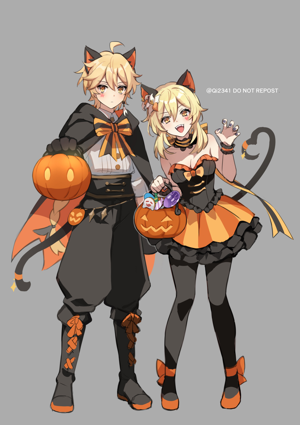 1boy 1girl aether_(genshin_impact) ahoge alternate_costume animal_ears baggy_pants bare_shoulders black_cape black_choker black_dress black_footwear black_gloves black_nails black_pants black_pantyhose black_ribbon blonde_hair boots bow bowtie braid breasts brother_and_sister brown_eyes bucket buttons candy cape cat_ears cat_tail choker closed_mouth dress earrings facial_mark fake_animal_ears fake_tail fang fingernails flower food frilled_choker frills full_body genshin_impact gloves grey_background hair_between_eyes hair_flower hair_ornament hair_ribbon halloween halloween_bucket halloween_costume hand_up heart heart_tail highres holding holding_bucket holding_halloween_bucket jewelry lollipop long_hair looking_at_viewer low-braided_long_hair low-tied_long_hair lumine_(genshin_impact) medium_breasts nail_polish open_mouth orange_bow orange_bowtie orange_cape orange_shoes orange_skirt pants pantyhose pumpkin_ornament qi2341 ribbon seelie_(genshin_impact) shirt shoes short_hair siblings sidelocks simple_background single_earring skirt sleeveless sleeveless_dress smile standing star_(symbol) star_facial_mark star_ornament strapless strapless_dress striped_bow striped_bowtie striped_clothes tail teeth two-sided_cape two-sided_fabric white_flower white_shirt wrist_cuffs yellow_bow