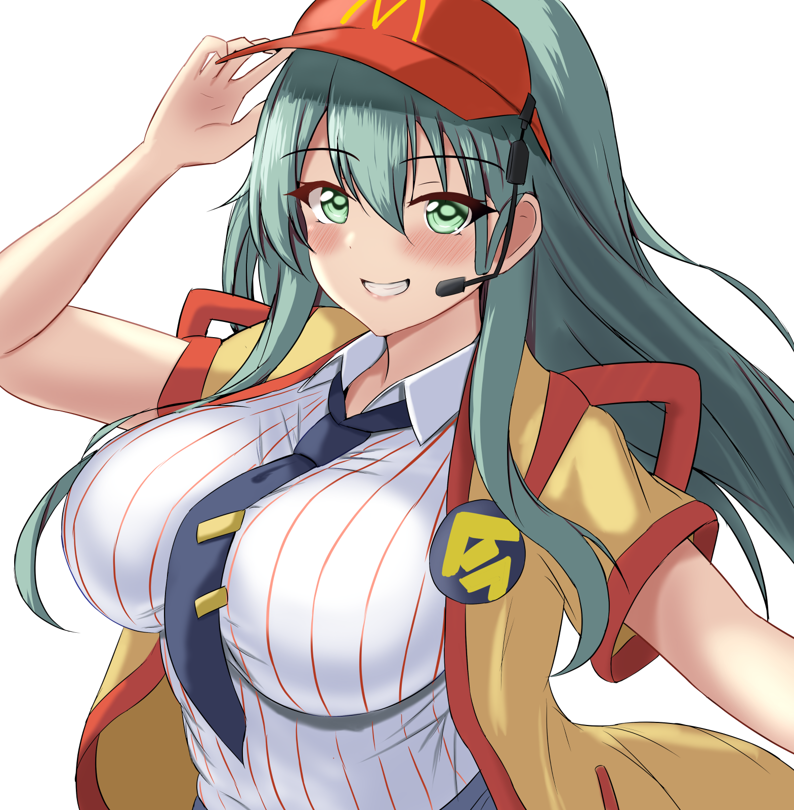 1girl badge blush breasts button_badge cosplay imadake_dabuchi_tabemi employee_uniform fast_food_uniform hat headset highres imadake_dabuchi_tabemi_(cosplay) kantai_collection large_breasts mcdonald's montemasa necktie shirt short_sleeves simple_background striped_clothes striped_shirt suzuya_(kancolle) tie_clip vertical-striped_clothes visor_cap white_shirt