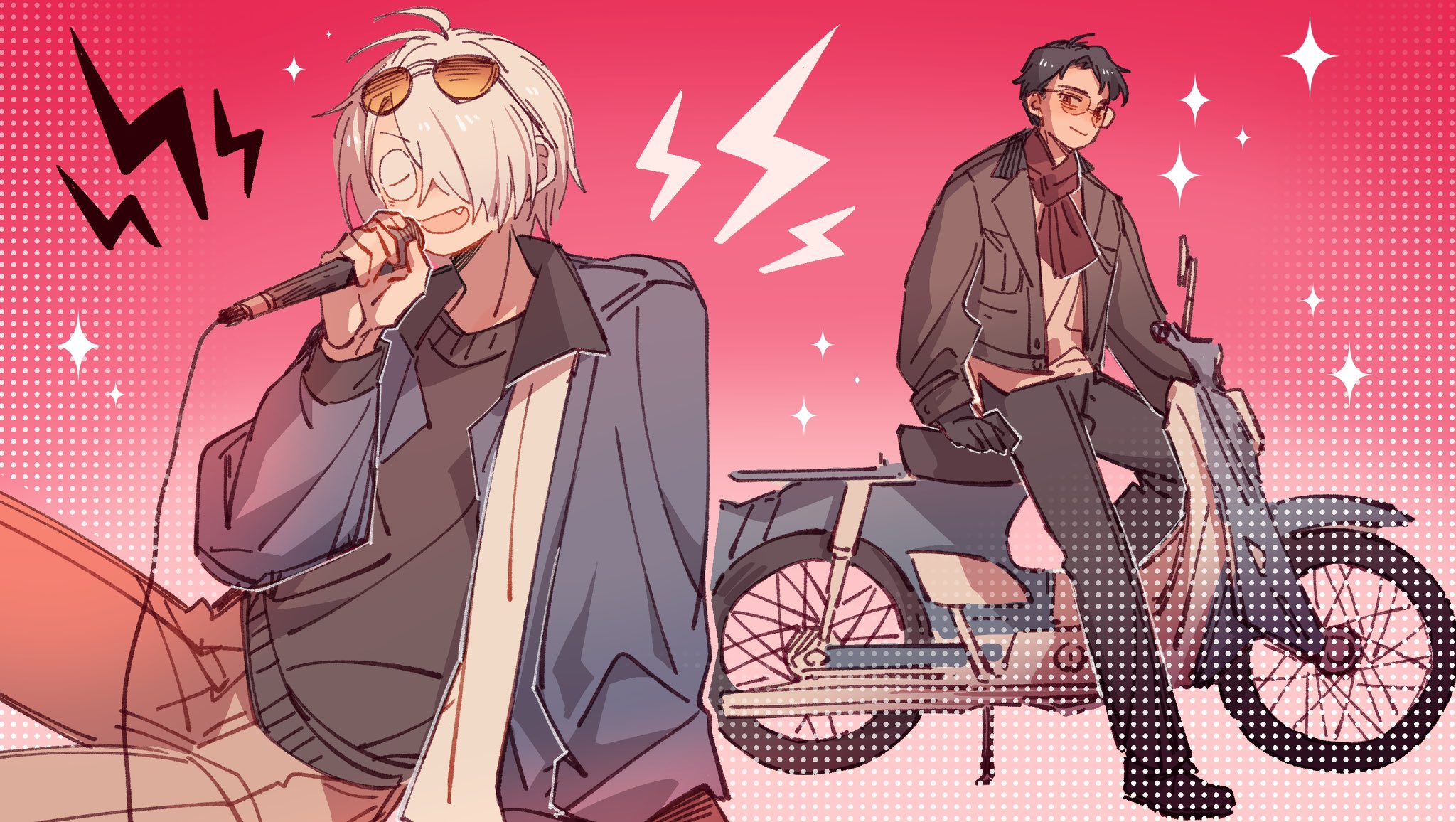2boys apt._(rose_&_bruno_mars) black_gloves blue_jacket brown_jacket eyewear_on_head fang gegege_no_kitarou gloves hair_over_one_eye highres holding holding_microphone jacket kitarou_tanjou:_gegege_no_nazo male_focus medama_oyaji_(human) microphone mizuki_(gegege_no_kitarou) motor_vehicle multiple_boys music naggguma on_scooter pink_background red_scarf scarf scooter sparkle stippling_(texture) sunglasses unworn_scarf white_scarf
