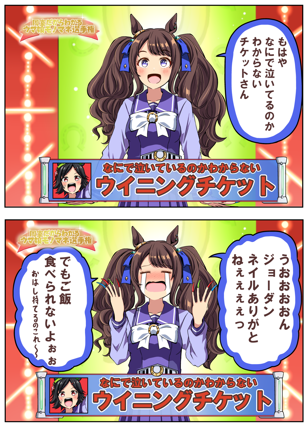 1girl black_hair blue_eyes breasts collarbone commentary_request crying double_v full_body hair_between_eyes hair_ornament highres komakasugite_tsutawaranai_monomane_senshuken long_hair looking_at_viewer medium_breasts open_mouth school_uniform shino_(ponjiyuusu) stage tosen_jordan_(umamusume) tracen_school_uniform translation_request twitter_username umamusume v winning_ticket_(umamusume)