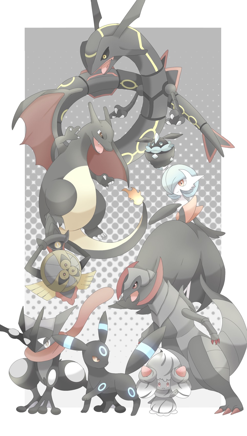 aegislash alcremie alcremie_(strawberry_sweet) alternate_color black_dress black_fur black_gloves black_skin blue_hair carbink charizard claws colored_skin dragon dress elbow_gloves fire gardevoir gen_1_pokemon gen_3_pokemon gen_5_pokemon gen_6_pokemon gen_8_pokemon gloves greninja h_k225 haxorus highres holding holding_shield legendary_pokemon mega_gardevoir mega_pokemon nintendo one-eyed open_mouth pokemon pokemon_(creature) rayquaza shield shiny_pokemon smile strapless strapless_dress sword weapon white_skin wings yellow_eyes